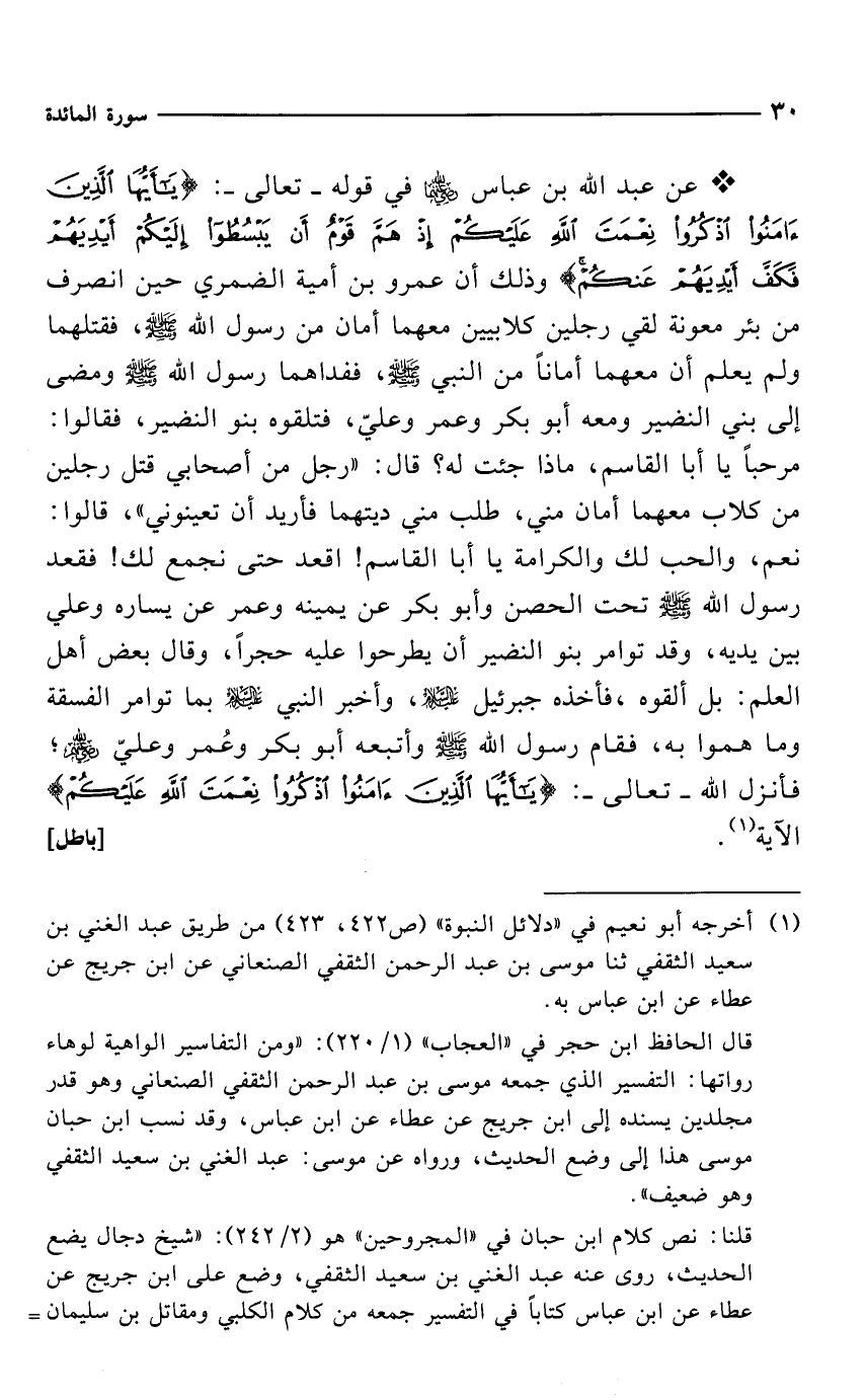 * عن عبد الله بن عباس -رضي الله عنهما- في قوله -تعالى-: {يَاأَيُّهَا الَّذِينَ آمَنُوا اذْكُرُوا نِعْمَتَ اللَّهِ عَلَيْكُمْ إِذْ هَمَّ قَوْمٌ أَنْ يَبْسُطُوا إِلَيْكُمْ أَيْدِيَهُمْ فَكَفَّ أَيْدِيَهُمْ عَنْكُمْ} وذلك أن عمرو بن أمية الضمري حين انصرف من بئر معونة لقي رجلين كلابيين معهما أمان من رسول الله - صلى الله عليه وسلم -، فقتلهما ولم يعلم أن معهما أمانًا من النبي - صلى الله عليه وسلم -، ففداهما رسول الله - صلى الله عليه وسلم - ومضى إلى بني النضير ومعه أبو بكر وعمر وعليّ، فتلقوه بنو النضير، فقالوا: مرحباً يا أبا القاسم، ماذا جئت له؟ قال: "رجل من أصحابي قتل رجلين من كلاب معهما أمان مني، طلب مني ديتهما فأريد أن تعينوني"، قالوا: نعم، والحب لك والكرامة يا أبا القاسم! اقعد حتى نجمع لك! فقعد رسول الله - صلى الله عليه وسلم - تحت الحصن وأبو بكر عن يمينه وعمر عن يساره وعلي بين يديه، وقد توامر بنو النضير أن يطرحوا عليه حجراً، وقال بعض أهل العلم: بل ألقوه، فأخذه جبرئيل -عليه السلام-، وأخبر النبي -عليه السلام- بما توامر الفسقة وما هموا به، فقام رسول الله - صلى الله عليه وسلم - وأتبعه أبو بكر وعُمر وعليّ -رضي الله عنهم-؛ فأنزل الله -تعالى-: {يَاأَيُّهَا الَّذِينَ آمَنُوا اذْكُرُوا نِعْمَتَ اللَّهِ عَلَيْكُمْ} الآية (¬1). [باطل]