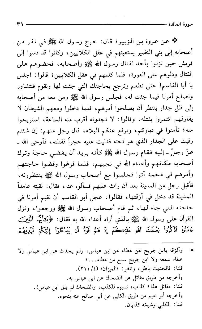 * عن عروة بن الزبير؛ قال: خرج رسول الله - صلى الله عليه وسلم - في نفر من أصحابه إلى بني النضير يستعينهم في عقل الكلابيين، وكانوا قد دسوا إلى قريش حين نزلوا بأحد لقتال رسول الله - صلى الله عليه وسلم - وأصحابه، فحضوهم على القتال ودلوهم على العورة، فلما كلمهم في عقل الكلابيين؛ قالوا: اجلس يا أبا القاسم! حتى تطعم وترجع بحاجتك التي جئت لها ونقوم فنتشاور ونصلح أمرنا فيما جئت له، فجلس رسول الله - صلى الله عليه وسلم - ومن معه من أصحابه إلى ظل جدار ينتظر أن يصلحوا أمرهم، فلما دخلوا ومعهم الشيطان لا يفارقهم ائتمروا بقتله، وقالوا: لا تجدونه أقرب منه الساعة، استريحوا منه؛ تأمنوا في دياركم، ويرفع عنكم البلاء، قال رجل منهم: إن شئتم رقيت على الجدار الذي هو تحته فدليت عليه حجراً فقتلته، فأوحى الله -عزّ وجلّ- إليه فقام رسول الله - صلى الله عليه وسلم - كأنه يريد أن يقضي حاجة وترك أصحابه مكانهم وأعداء الله في نجيهم، فلما فرغوا وقضوا حاجتهم وأمرهم في محمد أتوا فجلسوا مع أصحاب رسول الله - صلى الله عليه وسلم - ينتظرونه، فأقبل رجل من المدينة بعد أن راث عليهم فسألوه عنه، فقال: لقيته عامداً المدينة قد دخل في أزقتها، فقالوا: عجل أبو القاسم أن نقيم أمرنا في حاجته التي جاء لها، ثم قام أصحاب رسول الله - صلى الله عليه وسلم - ورجعوا، ونزل القرآن على رسول الله - صلى الله عليه وسلم - بالذي أراد أعداء الله به فقال: {يَاأَيُّهَا الَّذِينَ آمَنُوا اذْكُرُوا نِعْمَتَ اللَّهِ عَلَيْكُمْ إِذْ هَمَّ قَوْمٌ أَنْ يَبْسُطُوا إِلَيْكُمْ أَيْدِيَهُمْ