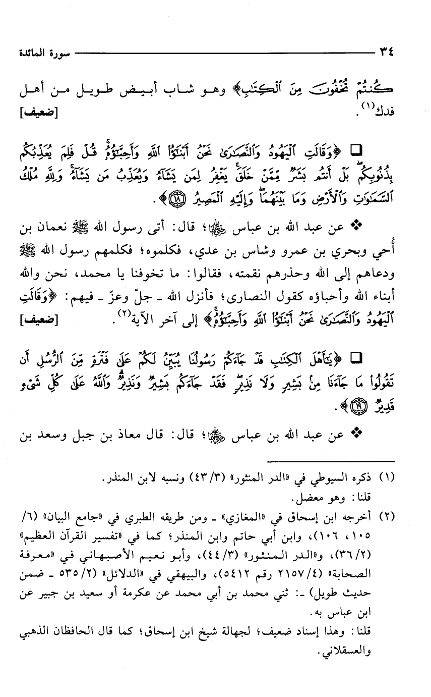 * عن عبد الله بن عباس -رضي الله عنهما-؛ قال: أتى رسول الله - صلى الله عليه وسلم - نعمان بن أُحي وبحري بن عمرو وشاس بن عدي، فكلموه؛ فكلمهم رسول الله - صلى الله عليه وسلم - ودعاهم إلى الله وحذرهم نقمته، فقالوا: ما تخوفنا يا محمد، نحن والله أبناء الله وأحباؤه كقول النصارى؛ فأنزل الله -جل وعزّ- فيهم: {وَقَالَتِ الْيَهُودُ وَالنَّصَارَى نَحْنُ أَبْنَاءُ اللَّهِ وَأَحِبَّاؤُهُ} إلى آخر الآية (¬2). [ضعيف]