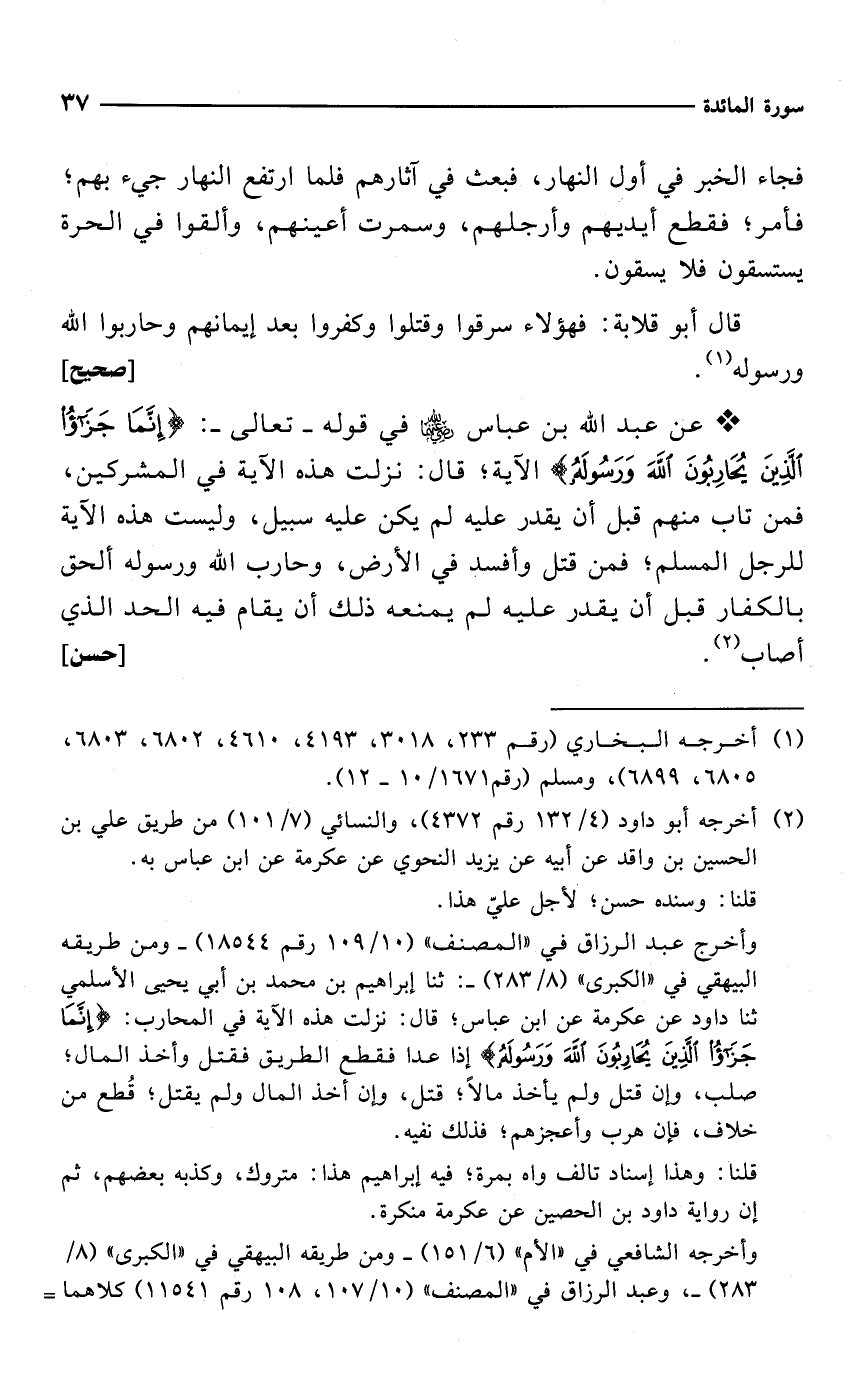 * عن عبد الله بن عباس -رضي الله عنهما- في قوله -تعالى-: {إِنَّمَا جَزَاءُ الَّذِينَ يُحَارِبُونَ اللَّهَ وَرَسُولَهُ} الآية؛ قال: نزلت هذه الآية في المشركين، فمن تاب منهم قبل أن يقدر عليه لم يكن عليه سبيل، وليست هذه الآية للرجل المسلم؛ فمن قتل وأفسد في الأرض، وحارب الله ورسوله ألحق بالكفار قبل أن يقدر عليه لم يمنعه ذلك أن يقام فيه الحد الذي أصاب (¬2). [حسن]