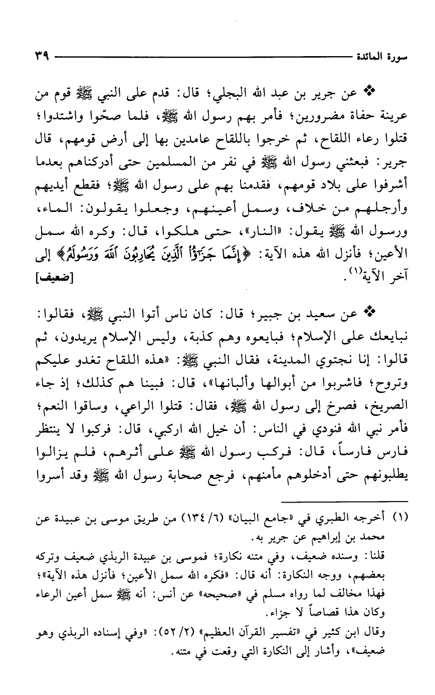 * عن جرير بن عبد الله البجلي؛ قال: قدم على النبي - صلى الله عليه وسلم - قوم من عرينة حفاة مضرورين؛ فأمر بهم رسول الله - صلى الله عليه وسلم -، فلما صحّوا واشتدوا؛ قتلوا رعاء اللقاح، ثم خرجوا باللقاح عامدين بها إلى أرض قومهم، قال جرير: فبعثني رسول الله - صلى الله عليه وسلم - في نفر من المسلمين حتى أدركناهم بعدما أشرفوا على بلاد قومهم، فقدمنا بهم على رسول الله - صلى الله عليه وسلم -؛ فقطع أيديهم وأرجلهم من خلاف، وسمل أعينهم، وجعلوا يقولون: الماء، ورسول الله - صلى الله عليه وسلم - يقول: "النار"، حتى هلكوا، قال: وكره الله سمل الأعين؛ فأنزل الله هذه الآية: {إِنَّمَا جَزَاءُ الَّذِينَ يُحَارِبُونَ اللَّهَ وَرَسُولَهُ} إلى آخر الآية (¬1). [ضعيف]