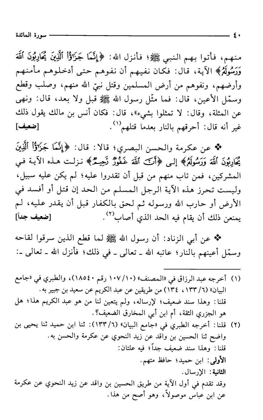 * عن عكرمة والحسن البصري؛ قالا: قال: {إِنَّمَا جَزَاءُ الَّذِينَ يُحَارِبُونَ اللَّهَ وَرَسُولَهُ} إلى {أَنَّ اللَّهَ غَفُورٌ رَحِيمٌ} نزلت هذه الآية في المشركين، فمن تاب منهم من قبل أن تقدروا عليه؛ لم يكن عليه سبيل، وليست تحرز هذه الآية الرجل المسلم من الحد إن قتل أو أفسد في الأرض أو حارب الله ورسوله ثم لحق بالكفار قبل أن يقدر عليه، لم يمنعن ذلك أن يقام فيه الحد الذي أصاب (¬2). [ضعيف جداً]