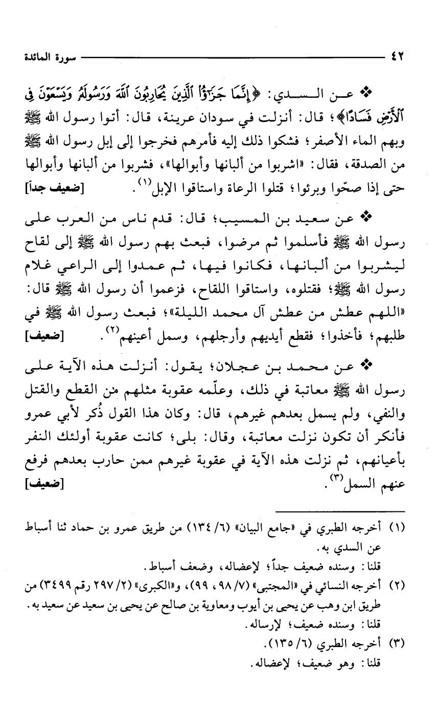 * عن السدي: {إِنَّمَا جَزَاءُ الَّذِينَ يُحَارِبُونَ اللَّهَ وَرَسُولَهُ وَيَسْعَوْنَ فِي الْأَرْضِ فَسَادًا}؛ قال: أنزلت في سودان عرينة، قال: أتوا رسول الله - صلى الله عليه وسلم - وبهم الماء الأصفر؛ فشكوا ذلك إليه فأمرهم فخرجوا إلى إبل رسول الله - صلى الله عليه وسلم - من الصدقة، فقال: "اشربوا من ألبانها وأبوالها"، فشربوا من ألبانها وأبوالها حتى إذا صحّوا وبرئوا؛ قتلوا الرعاة واستاقوا الإبل (¬1). [ضعيف جداً]