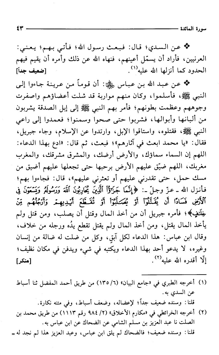 * عن السدي؛ قال: فبعث رسول الله؛ فأتي بهم؛ يعني: العرنيين، فأراد أن يسمّل أعينهم، فنهاه الله عن ذلك وأمره أن يقيم فيهم الحدود كما أنزلها الله عليه (¬1). [ضعيف جداً]