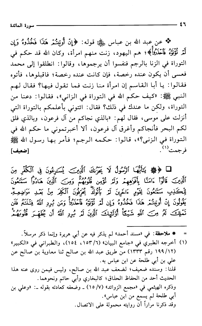 * عن عبد الله بن عباس -رضي الله عنهما- قوله: {إِنْ أُوتِيتُمْ هَذَا فَخُذُوهُ وَإِنْ لَمْ تُؤْتَوْهُ فَاحْذَرُوا}؛ هم اليهود، زنت منهم امرأة، وكان الله قد حكم في التوراة في الزنا بالرجم فنفسوا أن يرجموها، وقالوا: انطلقوا إلى محمد فعسى أن يكون عنده رخصة، فإن كانت عنده رخصة؛ فاقبلوها، فأتوه فقالوا: يا أبا القاسم إن امرأة منا زنت فما تقول فيها؟ فقال لهم النبي - صلى الله عليه وسلم -: "كيف حكم الله في التوراة في الزاني"، فقالوا: دعنا من التوراة، ولكن ما عندك في ذلك؟ فقال: ائتوني بأعلمكم بالتوراة التي أنزلت على موسى، فقال لهم: "بالذي نجاكم من آل فرعون، وبالذي فلق لكم البحر فأنجاكم وأغرق آل فرعون، ألا أخبرتموني ما حكم الله في التوراة في الزنى؟ "، قالوا: حكمه الرجم؛ فأمر بها رسول الله - صلى الله عليه وسلم - فرجمت (¬1). [ضعيف]