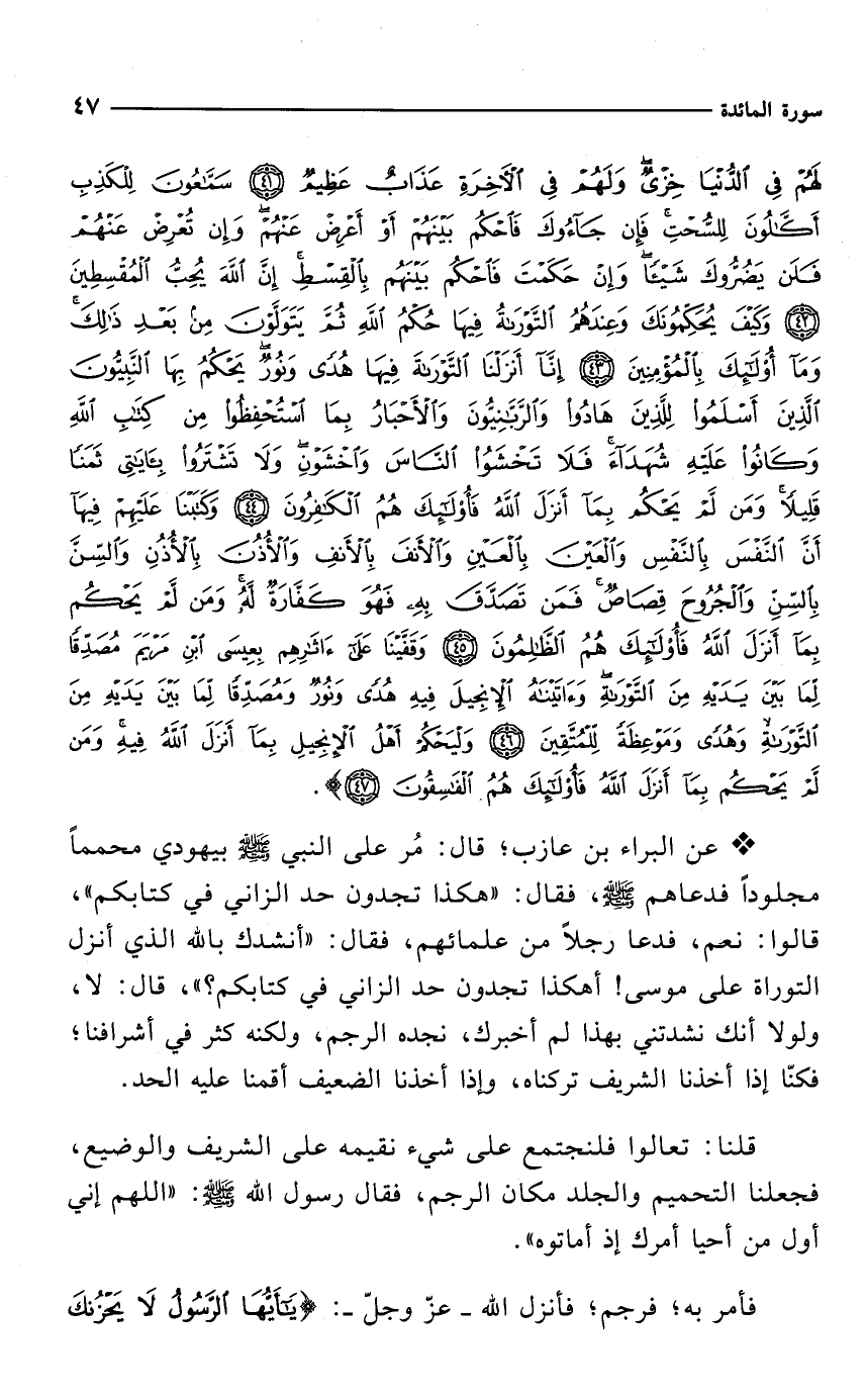 لَهُمْ فِي الدُّنْيَا خِزْيٌ وَلَهُمْ فِي الْآخِرَةِ عَذَابٌ عَظِيمٌ (41) سَمَّاعُونَ لِلْكَذِبِ أَكَّالُونَ لِلسُّحْتِ فَإِنْ جَاءُوكَ فَاحْكُمْ بَيْنَهُمْ أَوْ أَعْرِضْ عَنْهُمْ وَإِنْ تُعْرِضْ عَنْهُمْ فَلَنْ يَضُرُّوكَ شَيْئًا وَإِنْ حَكَمْتَ فَاحْكُمْ بَيْنَهُمْ بِالْقِسْطِ إِنَّ اللَّهَ يُحِبُّ الْمُقْسِطِينَ (42) وَكَيْفَ يُحَكِّمُونَكَ وَعِنْدَهُمُ التَّوْرَاةُ فِيهَا حُكْمُ اللَّهِ ثُمَّ يَتَوَلَّوْنَ مِنْ بَعْدِ ذَلِكَ وَمَا أُولَئِكَ بِالْمُؤْمِنِينَ (43) إِنَّا أَنْزَلْنَا التَّوْرَاةَ فِيهَا هُدًى وَنُورٌ يَحْكُمُ بِهَا النَّبِيُّونَ الَّذِينَ أَسْلَمُوا لِلَّذِينَ هَادُوا وَالرَّبَّانِيُّونَ وَالْأَحْبَارُ بِمَا اسْتُحْفِظُوا مِنْ كِتَابِ اللَّهِ وَكَانُوا عَلَيْهِ شُهَدَاءَ فَلَا تَخْشَوُا النَّاسَ وَاخْشَوْنِ وَلَا تَشْتَرُوا بِآيَاتِي ثَمَنًا قَلِيلًا وَمَنْ لَمْ يَحْكُمْ بِمَا أَنْزَلَ اللَّهُ فَأُولَئِكَ هُمُ الْكَافِرُونَ (44) وَكَتَبْنَا عَلَيْهِمْ فِيهَا أَنَّ النَّفْسَ بِالنَّفْسِ وَالْعَيْنَ بِالْعَيْنِ وَالْأَنْفَ بِالْأَنْفِ وَالْأُذُنَ بِالْأُذُنِ وَالسِّنَّ بِالسِّنِّ وَالْجُرُوحَ قِصَاصٌ فَمَنْ تَصَدَّقَ بِهِ فَهُوَ كَفَّارَةٌ لَهُ وَمَنْ لَمْ يَحْكُمْ بِمَا أَنْزَلَ اللَّهُ فَأُولَئِكَ هُمُ الظَّالِمُونَ (45) وَقَفَّيْنَا عَلَى آثَارِهِمْ بِعِيسَى ابْنِ مَرْيَمَ مُصَدِّقًا لِمَا بَيْنَ يَدَيْهِ مِنَ التَّوْرَاةِ وَآتَيْنَاهُ الْإِنْجِيلَ فِيهِ هُدًى وَنُورٌ وَمُصَدِّقًا لِمَا بَيْنَ يَدَيْهِ مِنَ التَّوْرَاةِ وَهُدًى وَمَوْعِظَةً لِلْمُتَّقِينَ (46) وَلْيَحْكُمْ أَهْلُ الْإِنْجِيلِ بِمَا أَنْزَلَ اللَّهُ فِيهِ وَمَنْ لَمْ يَحْكُمْ بِمَا أَنْزَلَ اللَّهُ فَأُولَئِكَ هُمُ الْفَاسِقُونَ (47)}.