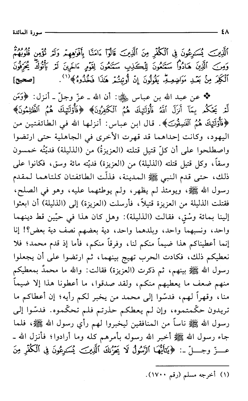 * عن عبد الله بن عباس -رضي الله عنهما-: أن الله -عزّ وجلّ- أنزل: {وَمَنْ لَمْ يَحْكُمْ بِمَا أَنْزَلَ اللَّهُ فَأُولَئِكَ هُمُ الْكَافِرُونَ} {فَأُولَئِكَ هُمُ الظَّالِمُونَ} {فَأُولَئِكَ هُمُ الْفَاسِقُونَ}. قال ابن عباس: أنزلها الله في الطائفتين من اليهود، وكانت إحداهما قد قهرت الأخرى في الجاهلية حتى ارتضوا واصطلحوا على أن كلّ قتيل قتلته (العزيزةُ) من (الذليلة) فديّتُه خمسون وسقًا، وكل قتيل قتلته (الذليلة) من (العزيزة) فديّته مائة وسق، فكانوا على ذلك، حتى قدم النبي - صلى الله عليه وسلم - المدينة، فذلّت الطائفتان كلتاهما لمقدم رسول الله - صلى الله عليه وسلم -، ويومئذ لم يظهر، ولم يوطئهما عليه، وهو في الصلح، فقتلت الذليلة من العزيزة قتيلًا، فأرسلت (العزيزة) إلى (الذليلة) أن ابعثوا إلينا بمائة وسْقٍ، فقالت (الذليلة): وهل كان هذا في حيّين قط دينهما واحد، ونسبهما واحد، وبلدهما واحد، دية بعضهم نصف دية بعض؟! إنا إنما أعطيناكم هذا ضيماً منكم لنا، وفرقاً منكم، فأما إذ قدم محمد؛ فلا نعطيكم ذلك، فكادت الحرب تهيج بينهما، ثم ارتضوا على أن يجعلوا رسول الله - صلى الله عليه وسلم - بينهم، ثم ذكرت (العزيزة) فقالت: والله ما محمدٌ بمعطيكم منهم ضعف ما يعطيهم منكم، ولقد صدقوا، ما أعطونا هذا إلا ضيماً منا، وقهراً لهم، فدسّوا إلى محمد من يخبر لكم رأيه؛ إن أعطاكم ما تريدون حكّمتموه، وإن لم يعطكم حذرتم فلم تحكّموه. فدسّوا إلى رسول الله - صلى الله عليه وسلم - ناساً من المنافقين ليخبروا لهم رأي رسول الله - صلى الله عليه وسلم -، فلما جاء رسول الله - صلى الله عليه وسلم - أخبر الله رسوله بأمرهم كله وما أرادوا؛ فأنزل الله -عزّ وجلّ-: {يَاأَيُّهَا الرَّسُولُ لَا يَحْزُنْكَ الَّذِينَ يُسَارِعُونَ فِي الْكُفْرِ مِنَ