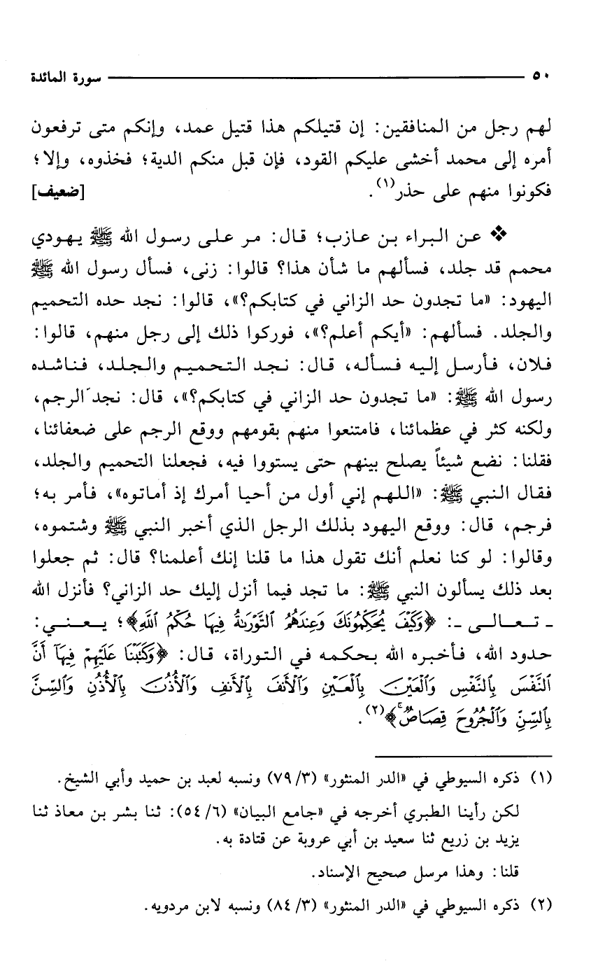 * عن البراء بن عازب؛ قال: مر على رسول الله - صلى الله عليه وسلم - يهودي محمد قد جلد، فسألهم ما شأن هذا؟ قالوا: زنى، فسأل رسول الله - صلى الله عليه وسلم - اليهود: "ما تجدون حد الزاني في كتابكم؟ "، قالوا: نجد حده التحميم والجلد. فسألهم: "أيكم أعلم؟ "، فوركوا ذلك إلى رجل منهم، قالوا: فلان، فأرسل إليه فسأله، قال: نجد التحميم والجلد، فناشده رسول الله - صلى الله عليه وسلم -: "ما تجدون حد الزاني في كتابكم؟ "، قال: نجد الرجم، ولكنه كثر في عظمائنا، فامتنعوا منهم بقومهم ووقع الرجم على ضعفائنا، فقلنا: نضع شيئاً يصلح بينهم حتى يستووا فيه، فجعلنا التحميم والجلد، فقال النبي - صلى الله عليه وسلم -: "اللهم إني أول من أحيا أمرك إذ أماتوه"، فأمر به؛ فرجم، قال: ووقع اليهود بذلك الرجل الذي أخبر النبي - صلى الله عليه وسلم - وشتموه، وقالوا: لو كنا نعلم أنك تقول هذا ما قلنا إنك أعلمنا؟ قال: ثم جعلوا بعد ذلك يسألون النبي - صلى الله عليه وسلم -: ما تجد فيما أنزل إليك حد الزاني؟ فأنزل الله -تعالى-: {وَكَيْفَ يُحَكِّمُونَكَ وَعِنْدَهُمُ التَّوْرَاةُ فِيهَا حُكْمُ اللَّهِ}؛ يعني: حدود الله، فأخبره الله بحكمه في التوراة، قال: {وَكَتَبْنَا عَلَيْهِمْ فِيهَا أَنَّ النَّفْسَ بِالنَّفْسِ وَالْعَيْنَ بِالْعَيْنِ وَالْأَنْفَ بِالْأَنْفِ وَالْأُذُنَ بِالْأُذُنِ وَالسِّنَّ بِالسِّنِّ وَالْجُرُوحَ قِصَاصٌ} (¬2).