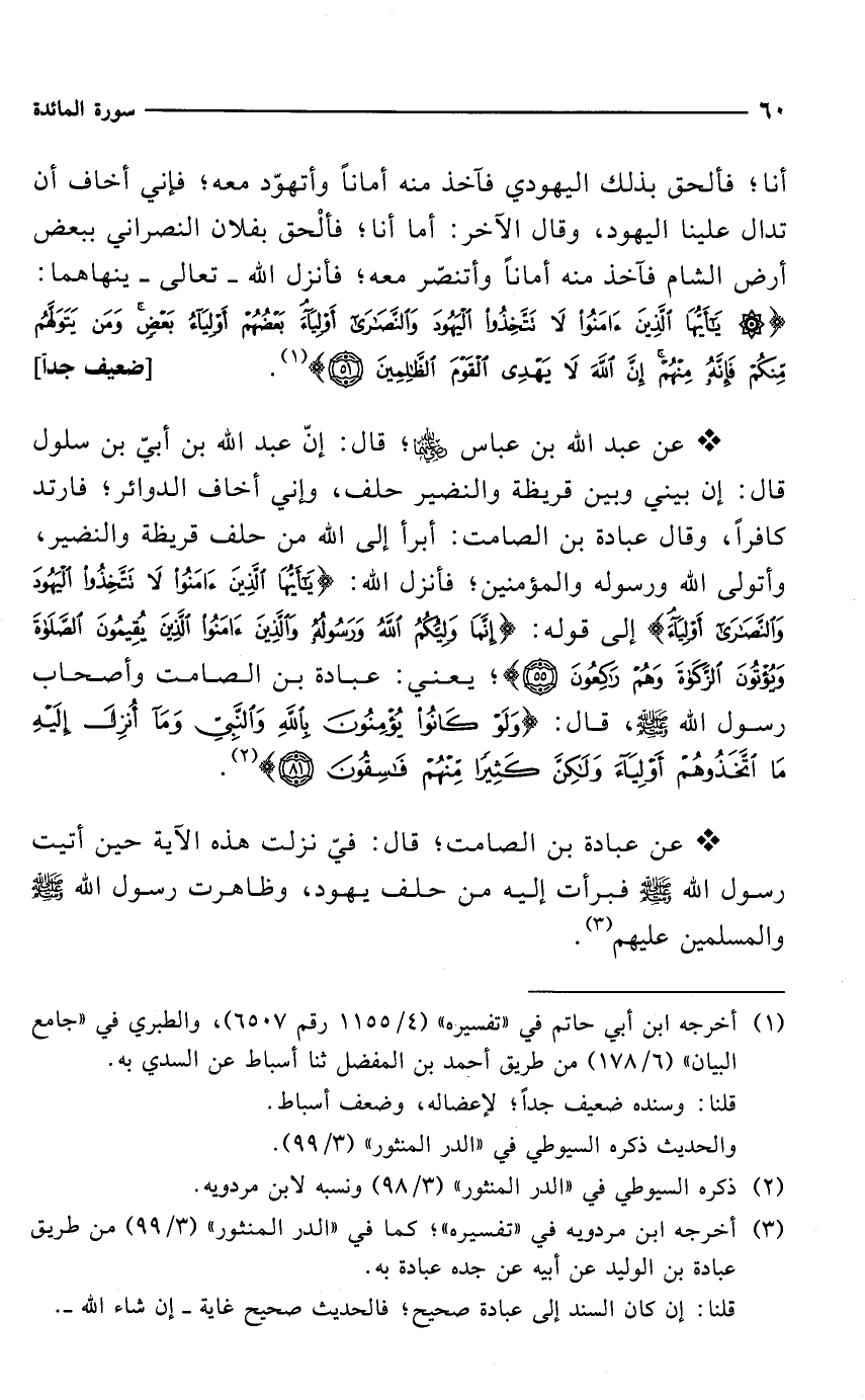 * عن عبد الله بن عباس -رضي الله عنهما-؛ قال: إنّ عبد الله بن أبيّ بن سلول قال: إن بيني وبين قريظة والنضير حلف، وإني أخاف الدوائر؛ فارتد كافراً، وقال عبادة بن الصامت: أبرأ إلى الله من حلف قريظة والنضير، وأتولى الله ورسوله والمؤمنين؛ فأنزل الله: {يَاأَيُّهَا الَّذِينَ آمَنُوا لَا تَتَّخِذُوا الْيَهُودَ وَالنَّصَارَى أَوْلِيَاءَ} إلى قوله: {إِنَّمَا وَلِيُّكُمُ اللَّهُ وَرَسُولُهُ وَالَّذِينَ آمَنُوا الَّذِينَ يُقِيمُونَ الصَّلَاةَ وَيُؤْتُونَ الزَّكَاةَ وَهُمْ رَاكِعُونَ (55)}؛ يعني: عبادة بن الصامت وأصحاب رسول الله - صلى الله عليه وسلم -، قال: {وَلَوْ كَانُوا يُؤْمِنُونَ بِاللَّهِ وَالنَّبِيِّ وَمَا أُنْزِلَ إِلَيْهِ مَا اتَّخَذُوهُمْ أَوْلِيَاءَ وَلَكِنَّ كَثِيرًا مِنْهُمْ فَاسِقُونَ (81)} (¬2).
