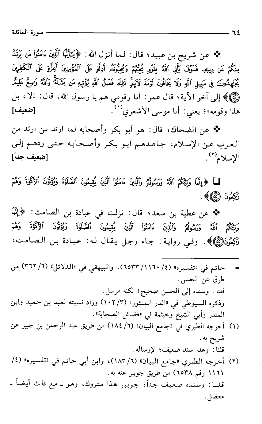 * عن عطية بن سعد؛ قال: نزلت في عبادة بن الصامت: {إِنَّمَا وَلِيُّكُمُ اللَّهُ وَرَسُولُهُ وَالَّذِينَ آمَنُوا الَّذِينَ يُقِيمُونَ الصَّلَاةَ وَيُؤْتُونَ الزَّكَاةَ وَهُمْ رَاكِعُونَ (55)}. وفي رواية: جاء رجل يقال له: عبادة بن الصامت،
