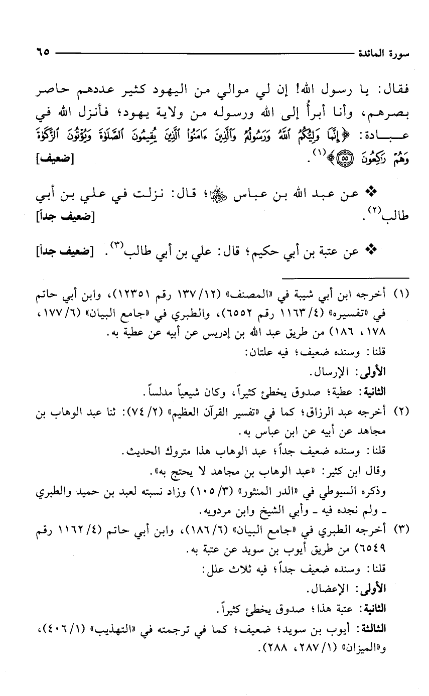فقال: يا رسول الله! إن لي موالي من اليهود كثير عددهم حاصر بصرهم، وأنا أبرأُ إلى الله ورسوله من ولاية يهود؛ فأنزل الله في عبادة: {إِنَّمَا وَلِيُّكُمُ اللَّهُ وَرَسُولُهُ وَالَّذِينَ آمَنُوا الَّذِينَ يُقِيمُونَ الصَّلَاةَ وَيُؤْتُونَ الزَّكَاةَ وَهُمْ رَاكِعُونَ (55)} (¬1). [ضعيف]