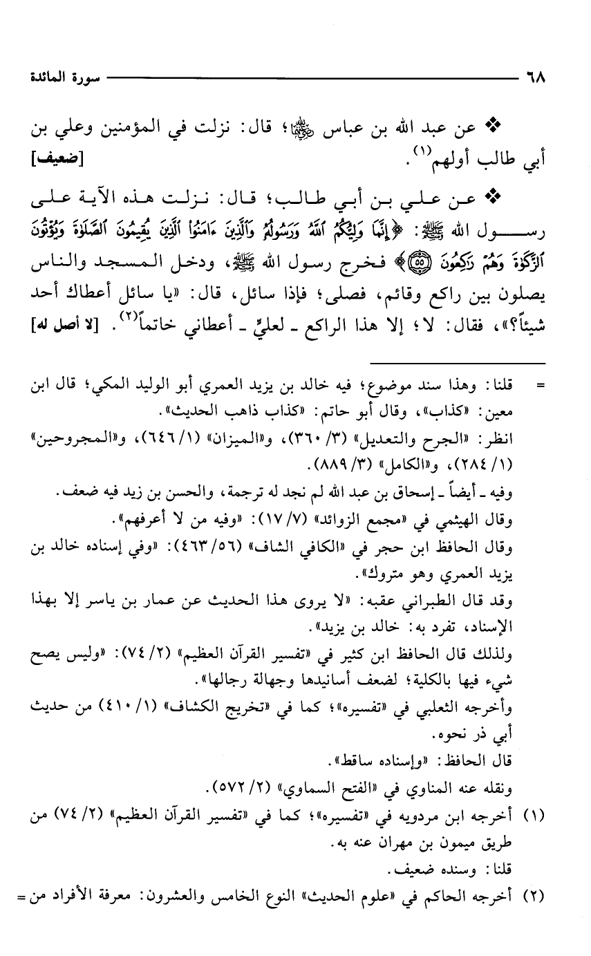 * عن علي بن أبي طالب؛ قال: نزلت هذه الآية على رسول الله - صلى الله عليه وسلم -: {إِنَّمَا وَلِيُّكُمُ اللَّهُ وَرَسُولُهُ وَالَّذِينَ آمَنُوا الَّذِينَ يُقِيمُونَ الصَّلَاةَ وَيُؤْتُونَ الزَّكَاةَ وَهُمْ رَاكِعُونَ (55)} فخرج رسول الله - صلى الله عليه وسلم -، ودخل المسجد والناس يصلون بين راكع وقائم، فصلى؛ فإذا سائل، قال: "يا سائل أعطاك أحد شيئًا؟ "، فقال: لا؛ إلا هذا الراكع -لعليٍّ- أعطاني خاتماً (¬2). [لا أصل له]