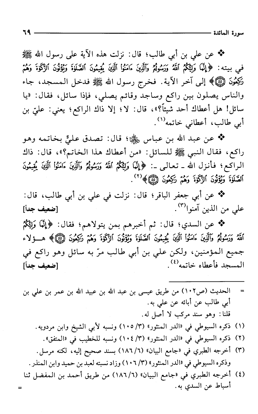 * عن السدي؛ قال: ثم أخبرهم بمن يتولاهم؛ فقال: {إِنَّمَا وَلِيُّكُمُ اللَّهُ وَرَسُولُهُ وَالَّذِينَ آمَنُوا الَّذِينَ يُقِيمُونَ الصَّلَاةَ وَيُؤْتُونَ الزَّكَاةَ وَهُمْ رَاكِعُونَ (55)} هؤلاء جميع المؤمنين، ولكن علي بن أبي طالب مرّ به سائل وهو راكع في المسجد فأعطاه خاتمه (¬4). [ضعيف جداً]
