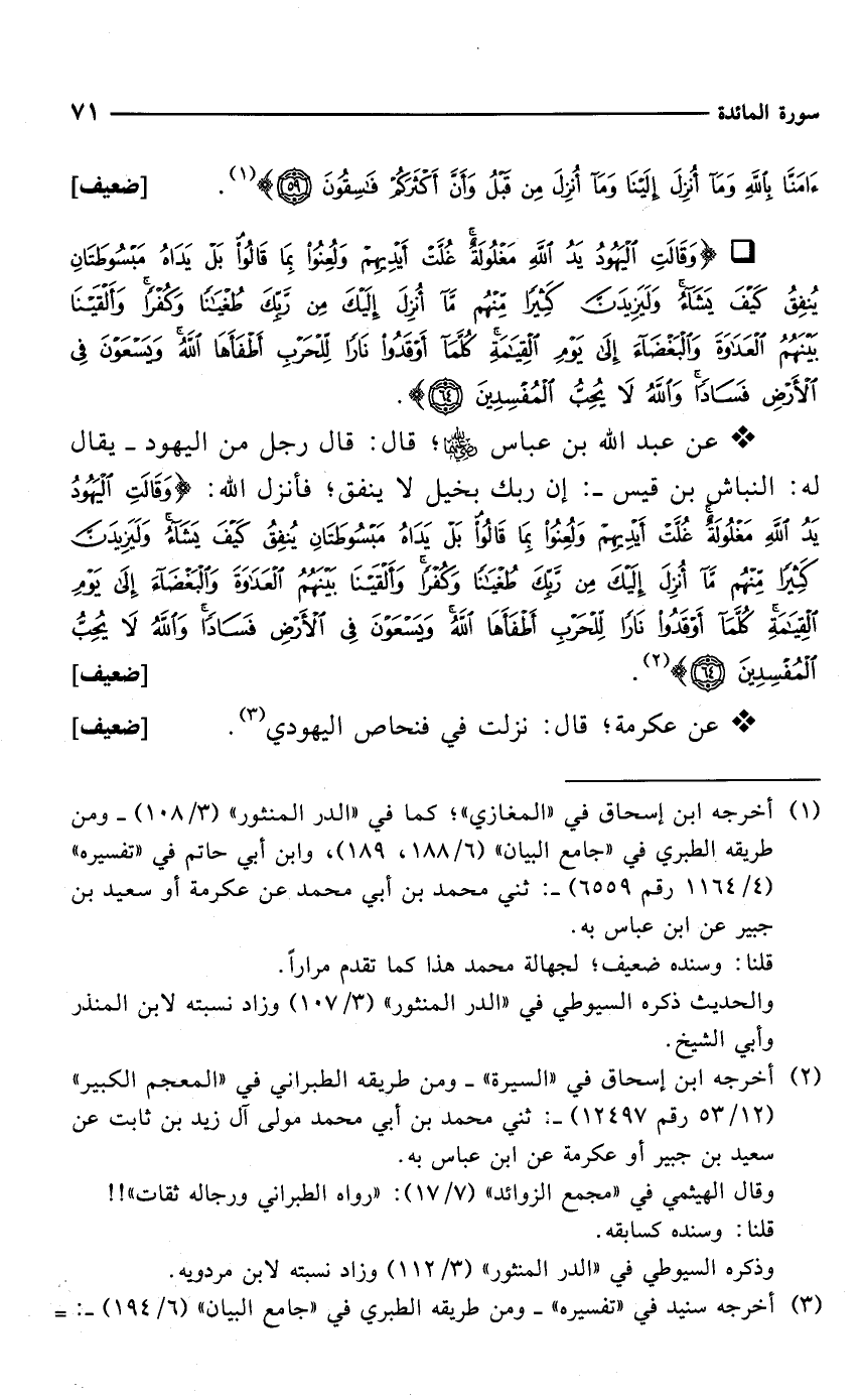 * عن عبد الله بن عباس -رضي الله عنهما-؛ قال: قال رجل من اليهود -يقال له: النباش بن قيس-: إن ربك بخيل لا ينفق؛ فأنزل الله: {وَقَالَتِ الْيَهُودُ يَدُ اللَّهِ مَغْلُولَةٌ غُلَّتْ أَيْدِيهِمْ وَلُعِنُوا بِمَا قَالُوا بَلْ يَدَاهُ مَبْسُوطَتَانِ يُنْفِقُ كَيْفَ يَشَاءُ وَلَيَزِيدَنَّ كَثِيرًا مِنْهُمْ مَا أُنْزِلَ إِلَيْكَ مِنْ رَبِّكَ طُغْيَانًا وَكُفْرًا وَأَلْقَيْنَا بَيْنَهُمُ الْعَدَاوَةَ وَالْبَغْضَاءَ إِلَى يَوْمِ الْقِيَامَةِ كُلَّمَا أَوْقَدُوا نَارًا لِلْحَرْبِ أَطْفَأَهَا اللَّهُ وَيَسْعَوْنَ فِي الْأَرْضِ فَسَادًا وَاللَّهُ لَا يُحِبُّ الْمُفْسِدِينَ (64)} (¬2). [ضعيف]