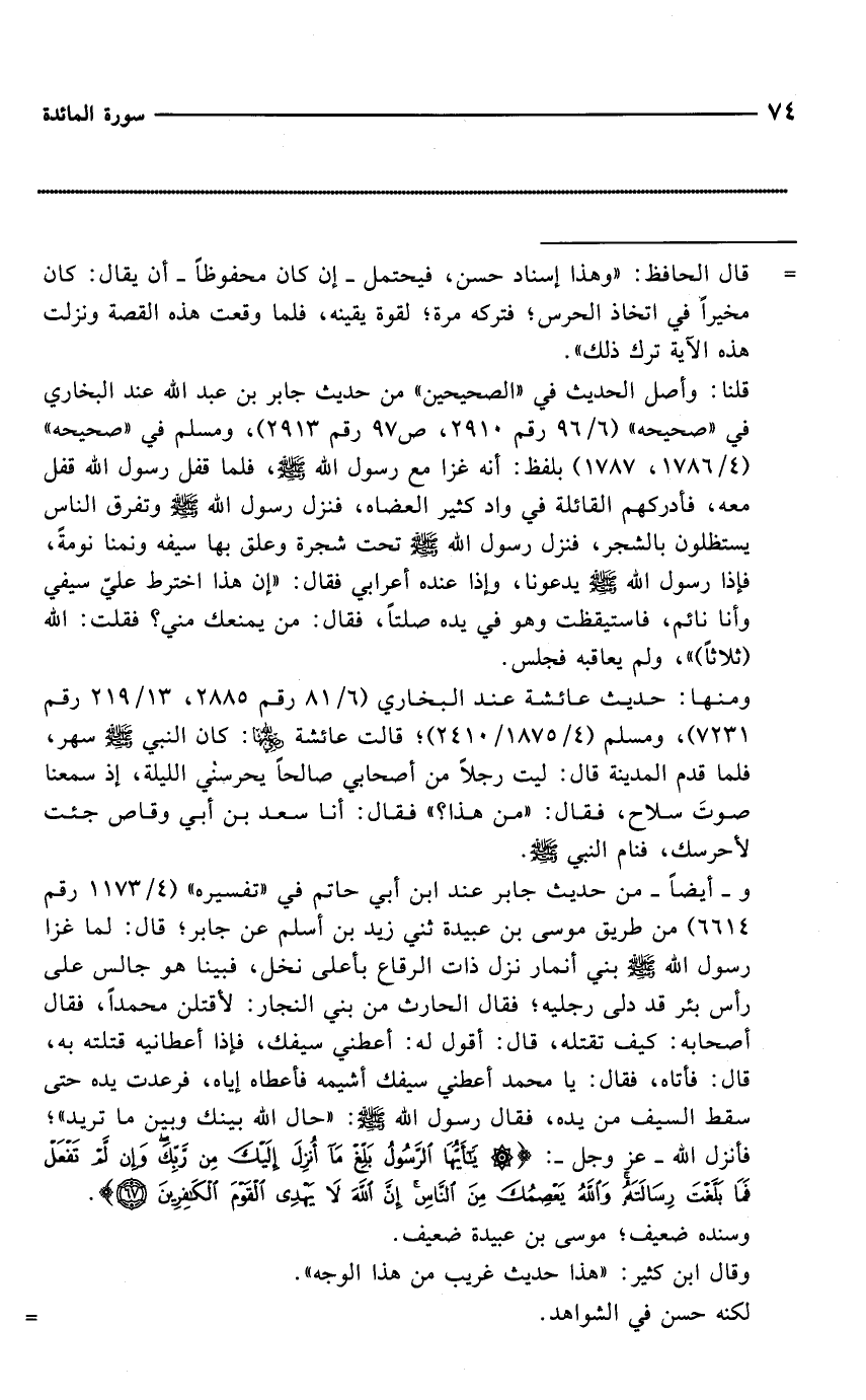 = قال الحافظ: "وهذا إسناد حسن، فيحتمل -إن كان محفوظاً- أن يقال: كان مخيراً في اتخاذ الحرس؛ فتركه مرة؛ لقوة يقينه، فلما وقعت هذه القصة ونزلت هذه الآية ترك ذلك".