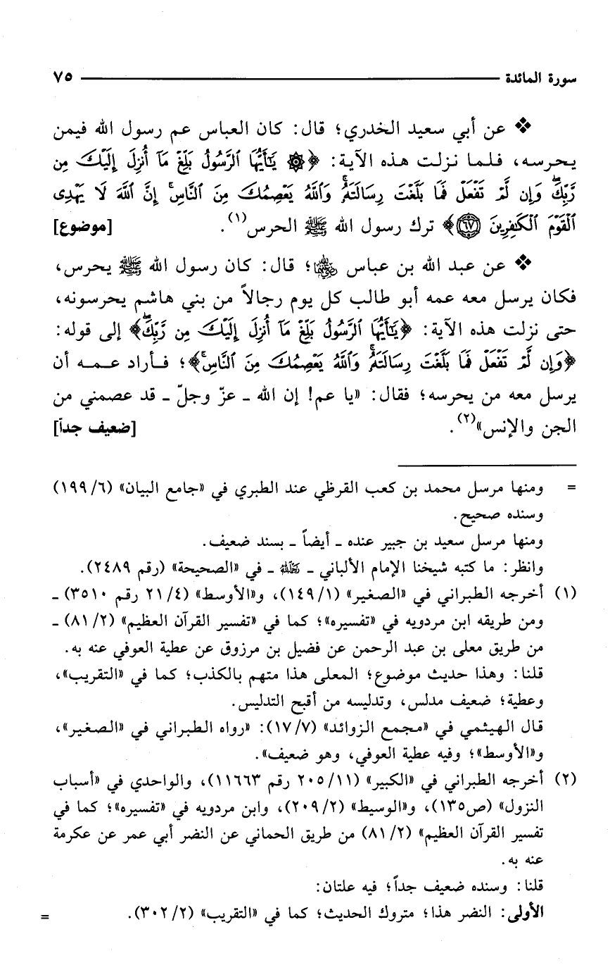 * عن أبي سعيد الخدري؛ قال: كان العباس عم رسول الله فيمن يحرسه، فلما نزلت هذه الآية: {يَاأَيُّهَا الرَّسُولُ بَلِّغْ مَا أُنْزِلَ إِلَيْكَ مِنْ رَبِّكَ وَإِنْ لَمْ تَفْعَلْ فَمَا بَلَّغْتَ رِسَالَتَهُ وَاللَّهُ يَعْصِمُكَ مِنَ النَّاسِ إِنَّ اللَّهَ لَا يَهْدِي الْقَوْمَ الْكَافِرِينَ (67)} ترك رسول الله - صلى الله عليه وسلم - الحرس (¬1). [موضوع]