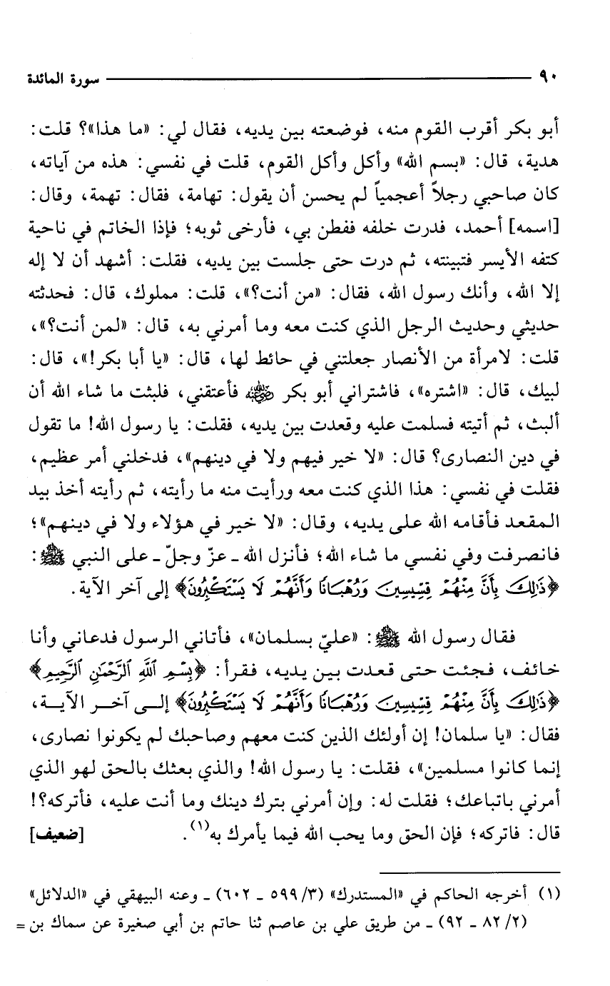 أبو بكر أقرب القوم منه، فوضعته بين يديه، فقال لي: "ما هذا"؟ قلت: هدية، قال: "بسم الله" وأكل وأكل القوم، قلت في نفسي: هذه من آياته، كان صاحبي رجلًا أعجمياً لم يحسن أن يقول: تهامة، فقال: تهمة، وقال: [اسمه] أحمد، فدرت خلفه ففطن بي، فأرخى ثوبه؛ فإذا الخاتم في ناحية كتفه الأيسر فتبينته، ثم درت حتى جلست بين يديه، فقلت: أشهد أن لا إله إلا الله، وأنك رسول الله، فقال: "من أنت؟ "، قلت: مملوك، قال: فحدثته حديثي وحديث الرجل الذي كنت معه وما أمرني به، قال: "لمن أنت؟ "، قلت: لامرأة من الأنصار جعلتني في حائط لها، قال: "يا أبا بكر! "، قال: لبيك، قال: "اشتره"، فاشتراني أبو بكر -رضي الله عنه- فأعتقني، فلبثت ما شاء الله أن ألبث، ثم أتيته فسلمت عليه وقعدت بين يديه، فقلت: يا رسول الله! ما تقول في دين النصارى؟ قال: "لا خير فيهم ولا في دينهم"، فدخلني أمر عظيم، فقلت في نفسي: هذا الذي كنت معه ورأيت منه ما رأيته، ثم رأيته أخذ بيد المقعد فأقامه الله على يديه، وقال: "لا خير في هؤلاء ولا في دينهم"؛ فانصرفت وفي نفسي ما شاء الله؟ فأنزل الله -عزّ وجلّ- على النبي - صلى الله عليه وسلم -: {ذَلِكَ بِأَنَّ مِنْهُمْ قِسِّيسِينَ وَرُهْبَانًا وَأَنَّهُمْ لَا يَسْتَكْبِرُونَ} إلى آخر الآية.