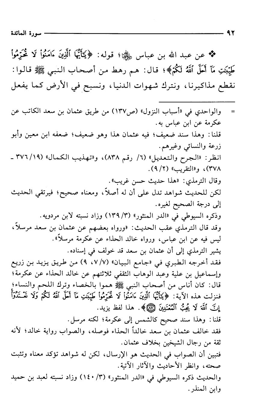 * عن عبد الله بن عباس -رضي الله عنهما-؛ قوله: {يَاأَيُّهَا الَّذِينَ آمَنُوا لَا تُحَرِّمُوا طَيِّبَاتِ مَا أَحَلَّ اللَّهُ لَكُمْ}؛ قال: هم رهط من أصحاب النبي - صلى الله عليه وسلم - قالوا: نقطع مذاكيرنا، ونترك شهوات الدنيا، ونسبح في الأرض كما يفعل