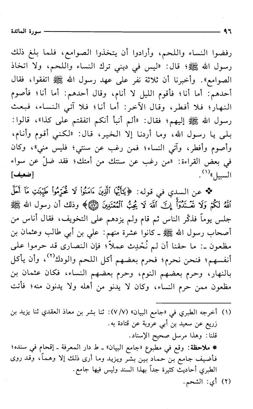 * عن السدي في قوله: {يَاأَيُّهَا الَّذِينَ آمَنُوا لَا تُحَرِّمُوا طَيِّبَاتِ مَا أَحَلَّ اللَّهُ لَكُمْ وَلَا تَعْتَدُوا إِنَّ اللَّهَ لَا يُحِبُّ الْمُعْتَدِينَ (87)} وذلك أن رسول الله - صلى الله عليه وسلم - جلس يوماً فذكّر الناس ثم قام ولم يزدهم على التخويف، فقال أناس من أصحاب رسول الله - صلى الله عليه وسلم -كانوا عشرة منهم: علي بن أبي طالب وعثمان بن مظعون-: ما حقنا أن لم نُحْدِث عملًا؛ فإن النصارى قد حرموا على أنفسهم؛ فنحن نحرم؛ فحرم بعضهم أكل اللحم والودك (¬2)، وأن يأكل بالنهار، وحرم بعضهم النوم، وحرم بعضهم النساء، فكان عثمان بن مظعون ممن حرم النساء، وكان لا يدنو من أهله ولا يدنون منه؛ فأتت