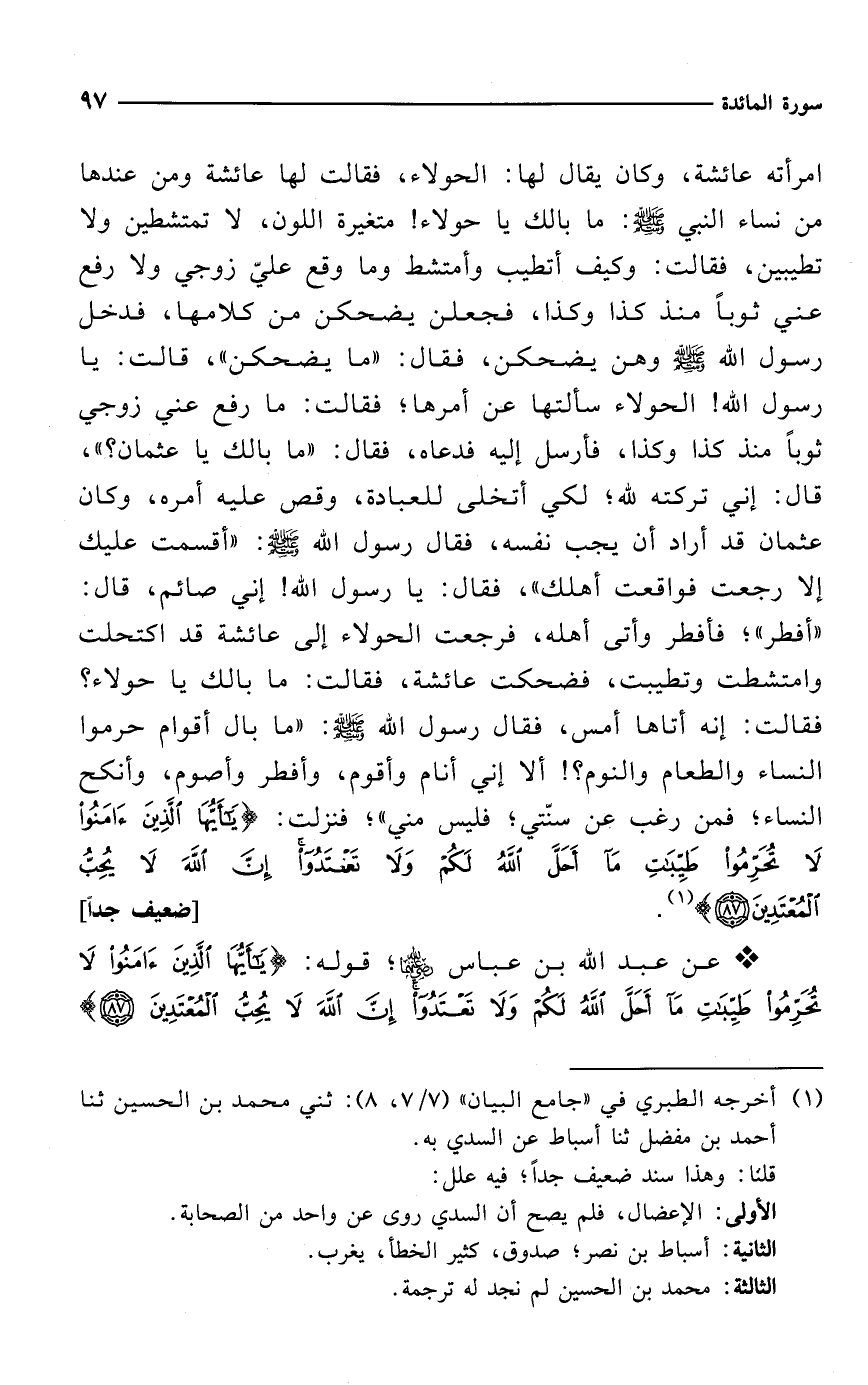 * عن عبد الله بن عباس -رضي الله عنهما-؛ قوله: {يَاأَيُّهَا الَّذِينَ آمَنُوا لَا تُحَرِّمُوا طَيِّبَاتِ مَا أَحَلَّ اللَّهُ لَكُمْ وَلَا تَعْتَدُوا إِنَّ اللَّهَ لَا يُحِبُّ الْمُعْتَدِينَ (87)}