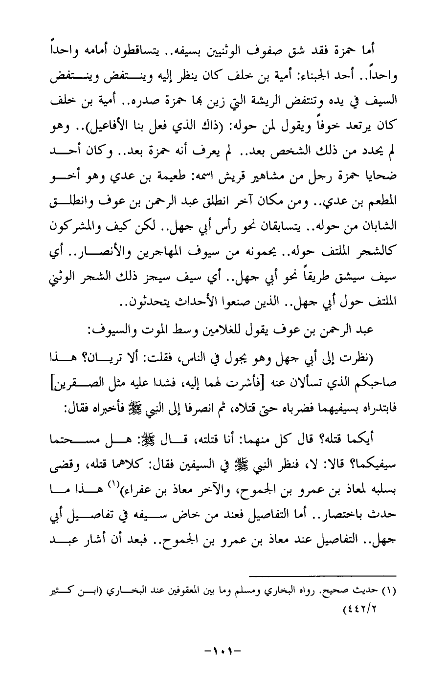 أما حمزة فقد شق صفوف الوثنيين بسيفه .. يتساقطون أمامه واحدًا واحدًا .. أحد الجبناء: أمية بن خلف كان ينظر إليه وينتفض وينتفض السيف في يده وتنتفض الريشة التي زين بها حمزة صدره .. أمية بن خلف كان يرتعد خوفًا ويقول لمن حوله: (ذاك الذي فعل بنا الأفاعيل) .. وهو لم يحدد من ذلك الشخص بعد .. لم يعرف أنه حمزة بعد .. وكان أحد ضحايا حمزة رجل من مشاهير قريش اسمه: طعيمة بن عدي وهو أخو المطعم بن عدي .. ومن مكان آخر انطلق عبد الرحمن بن عوف وانطلق الشابان من حوله .. يتسابقان نحو رأس أبي جهل .. لكن كيف والمشركون كالشجر الملتف حوله .. يحمونه من سيوف المهاجرين والأنصار .. أي سيف سيشق طريقًا نحو أبي جهل .. أي سيف سيجز ذلك الشجر الوثني الملتف حول أبي جهل .. الذين صنعوا الأحداث يتحدثون ..