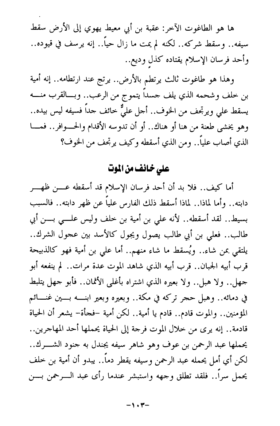 وهذا هو طاغوت ثالث يرتطم بالأرض .. يرتج عند إرتطامه .. إنه أمية بن خلف وشحمه الذي يلف جسدًا يتموج من الرعب .. وبالقرب منه يسقط علي ويرتجف من الخوف .. أجل عليٌّ خائف جدًا فسيفه ليس بيده .. وهو يحشى طعنة من هنا أو هناك .. أو أن تدوسه الأقدام والحوافر .. فما الذي أصاب عليًا .. ومن الذي أسقطه وكيف يرتجف من الخوف؟