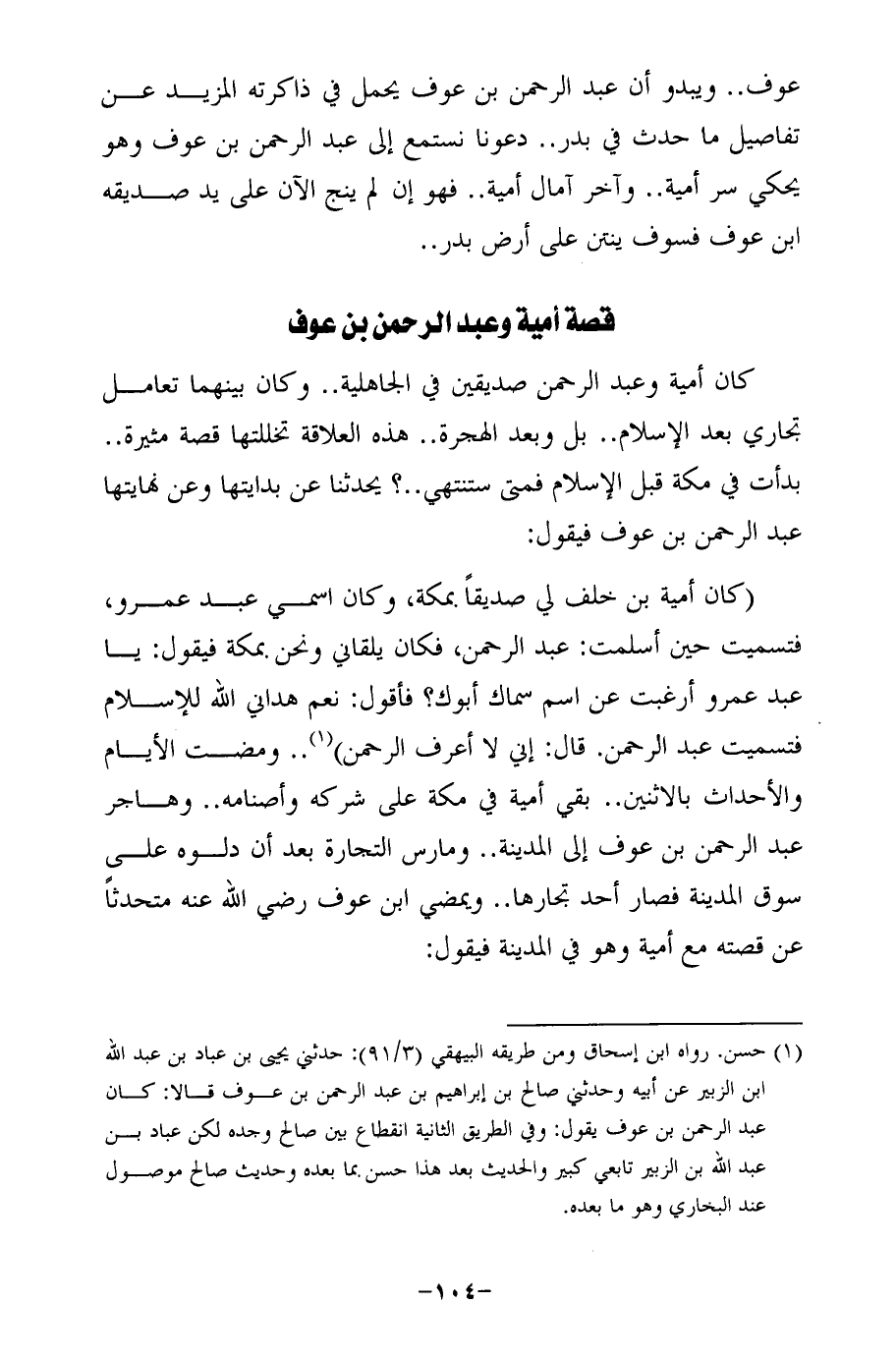 عوف .. ويبدو أن عبد الرحمن بن عوف يحمل في ذاكرته المزيد عن تفاصيل ما حدث في بدر .. دعونا نستمع إلى عبد الرحمن بن عوف وهو يحكى سر أمية .. وآخر آمال أمية .. فهو إن لم ينج الآن على يد صديقه ابن عوف فسوف ينتن على أرض بدر ..