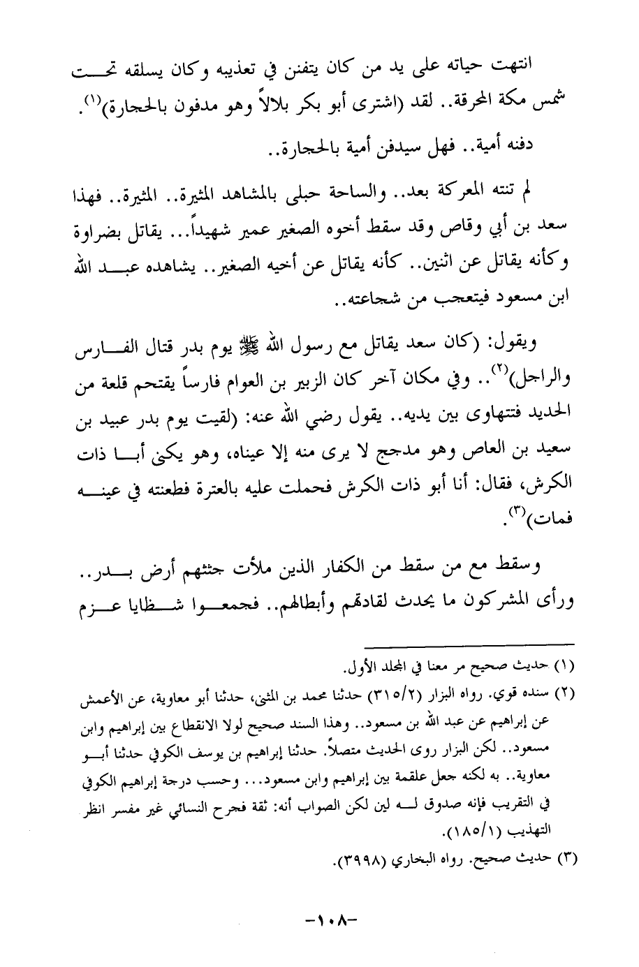 لم تنته المعركة بعد .. والساحة حبلى بالمشاهد المثيرة .. المثيرة .. فهذا سعد بن أبي وقاص وقد سقط أخوه الصغير عمير شهيدًا ... يقاتل بضراوة وكأنه يقاتل عن اثنين .. كأنه يقاتل عن أخيه الصغير .. يشاهده عبد الله ابن مسعود فيتعجب من شجاعته ..