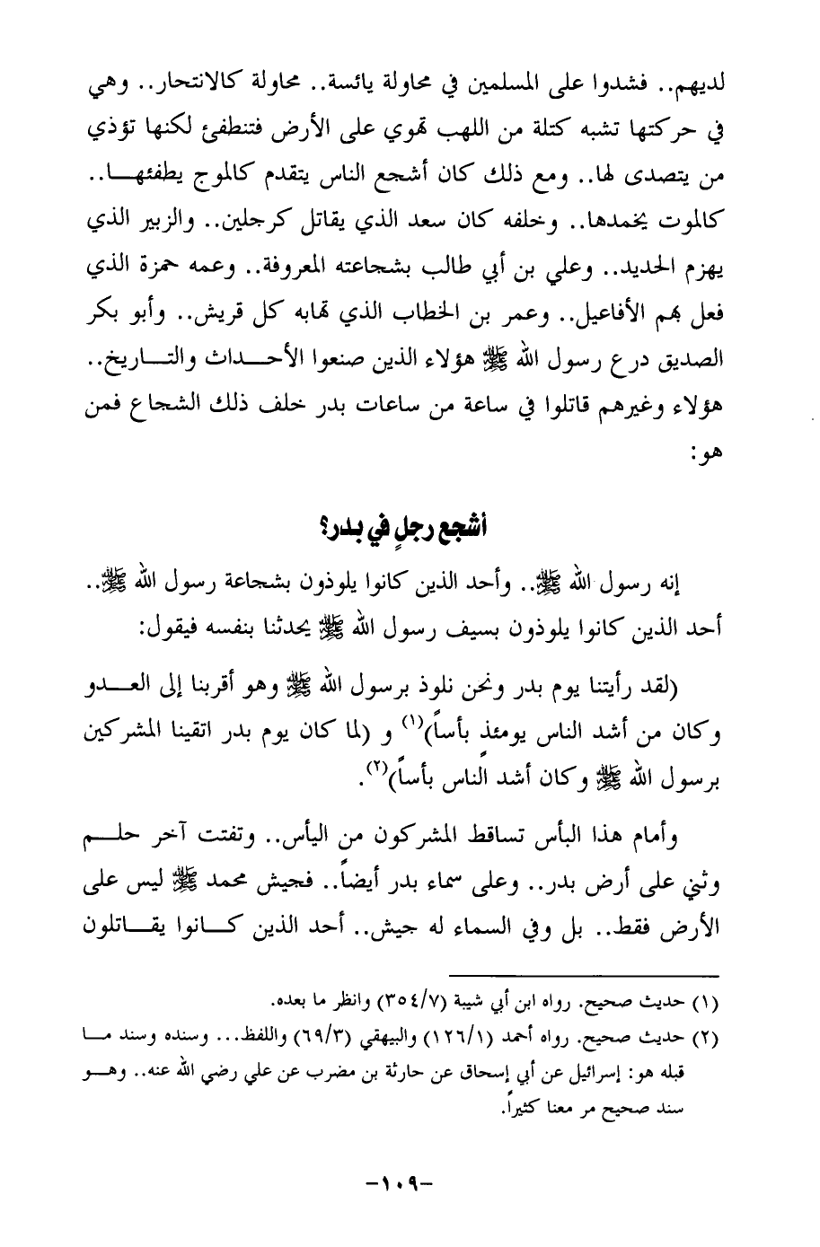 لديهم .. فشدوا على المسلمين في محاولة يائسة .. محاولة كالانتحار .. وهي في حركتها تشبه كتلة من اللهب تهوي على الأرض فتنطفئ لكنها تؤذي من يتصدى لها .. ومع ذلك كان أشجع الناس يتقدم كالموج يطفئها .. كالموت يخمدها .. وخلفه كان سعد الذي يقاتل كرجلين .. والزبير الذي يهزم الحديد .. وعلي بن أبي طالب بشجاعته المعروفة .. وعمه حمزة الذي فعل بهم الأفاعيل .. وعمر بن الخطاب الذي تهابه كل قريش .. وأبو بكر الصديق درع رسول الله - صلى الله عليه وسلم - هؤلاء الذين صنعوا الأحداث والتاريخ .. هؤلاء وغيرهم قاتلوا في ساعة من ساعات بدر خلف ذلك الشجاع فمن هو: