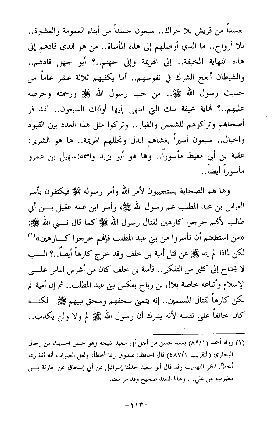 جسدًا من قريش بلا حراك .. سبعون جسدًا من أبناء العمومة والعشيرة .. بلا أرواح .. ما الذي أوصلهم إلى هذه المأساة .. من هو الذي قادهم إلى هذه النهاية المخيفة .. إلى الهزيمة وإلى جهنم .. ؟ أبو جهل قادهم .. والشيطان أجج الشرك في نفوسهم .. أما يكفيهم ثلاثة عشر عامًا من حديث رسول الله - صلى الله عليه وسلم - .. من حب رسول الله - صلى الله عليه وسلم - ورحمته وحرصه عليهم .. ؟ نهاية مخيفة تلك التي انتهى إليها أولئك السبعون .. لقد فر أصحابهم وتركوهم للشمس والغبار .. وتركوا مثل هذا العدد بين القيود والحبال .. سبعون أسيرًا يغشاهم الذل وتجللهم الهزيمة .. ها هو الشرير: عقبة بن أبي معيط مأسورًا .. وها هو أبو يزيد واسمه: سهيل بن عمرو مأسورًا أيضًا ..