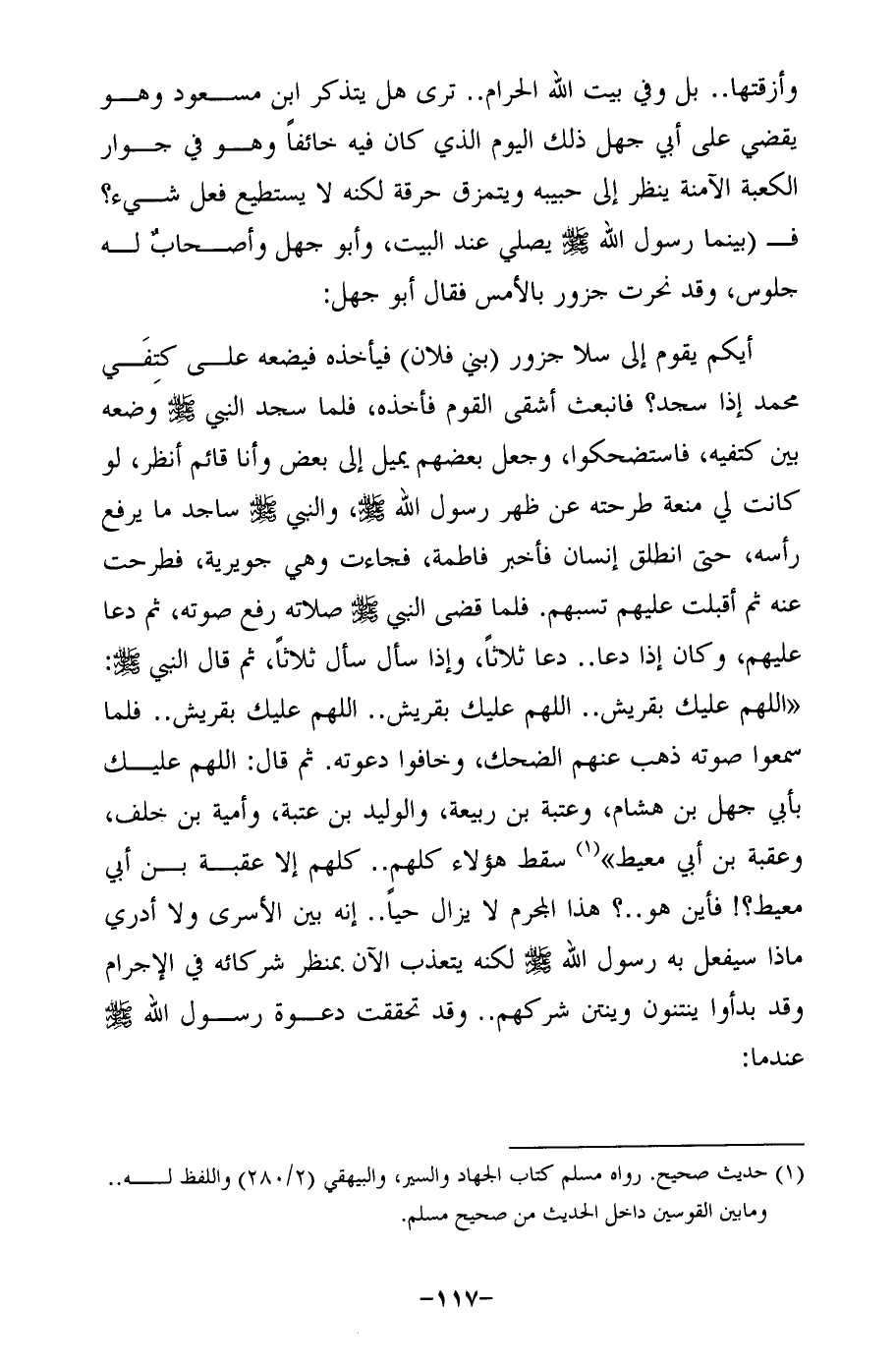وأزقتها .. بل وفي بيت الله الحرام .. ترى هل يتذكر ابن مسعود وهو يقضي على أبي جهل ذلك اليوم الذي كان فيه خائفًا وهو في جوار الكعبة الآمنة ينظر إلى حبيبه ويتمزق حرقة لكنه لا يستطيع فعل شيء؟ فـ (بينما رسول الله - صلى الله عليه وسلم - يصلي عند البيت، وأبو جهل وأصحابٌ له جلوس، وقد نحرت جزور بالأمس فقال أبو جهل: