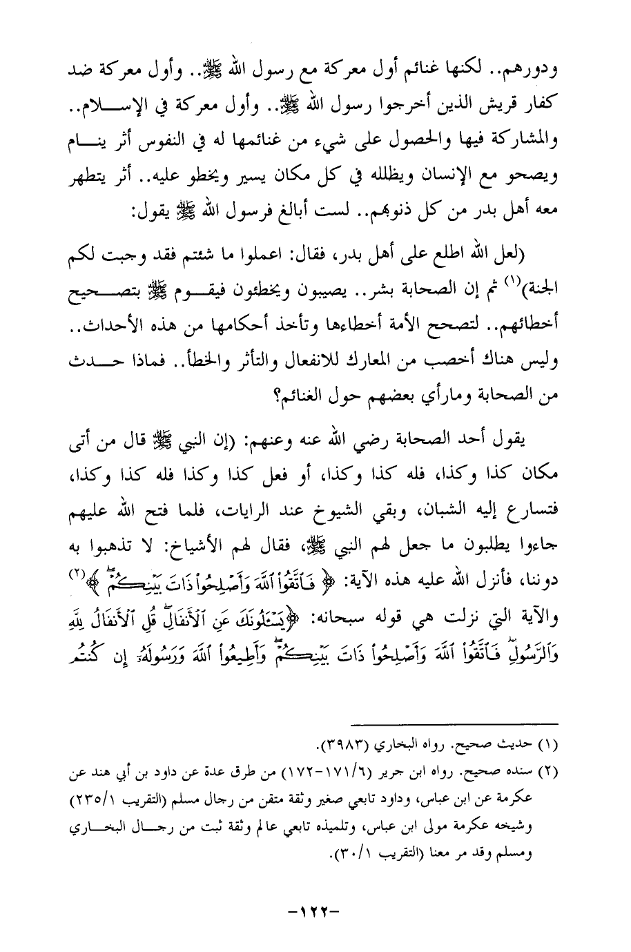 ودورهم .. لكنها غنائم أول معركة مع رسول الله - صلى الله عليه وسلم - .. وأول معركة ضد كفار قريش الذين أخرجوا رسول الله - صلى الله عليه وسلم - .. وأول معركة في الإِسلام .. والمشاركة فيها والحصول على شيء من غنائمها له في النفوس أثر ينام ويصحو مع الإنسان ويظلله في كل مكان يسير ويخطو عليه .. أثر يتطهر معه أهل بدر من كل ذنوبهم .. لست أبالغ فرسول الله - صلى الله عليه وسلم - يقول: