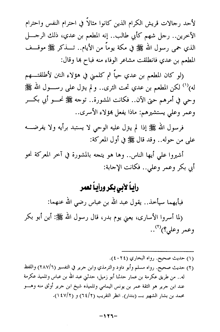(لو كان المطعم بن عدي حيًا ثم كلمني في هؤلاء النتن لأطلقتهم له) (¬1) لكن المطعم بن عدي تحت الثرى .. ولم ينزل على رسول الله - صلى الله عليه وسلم - وحي في أمرهم حتى الآن .. فكانت المشورة .. توجه - صلى الله عليه وسلم - نحو أبي بكر وعمر وعلي يستشيرهم: ماذا يفعل بهؤلاء الأسرى ..