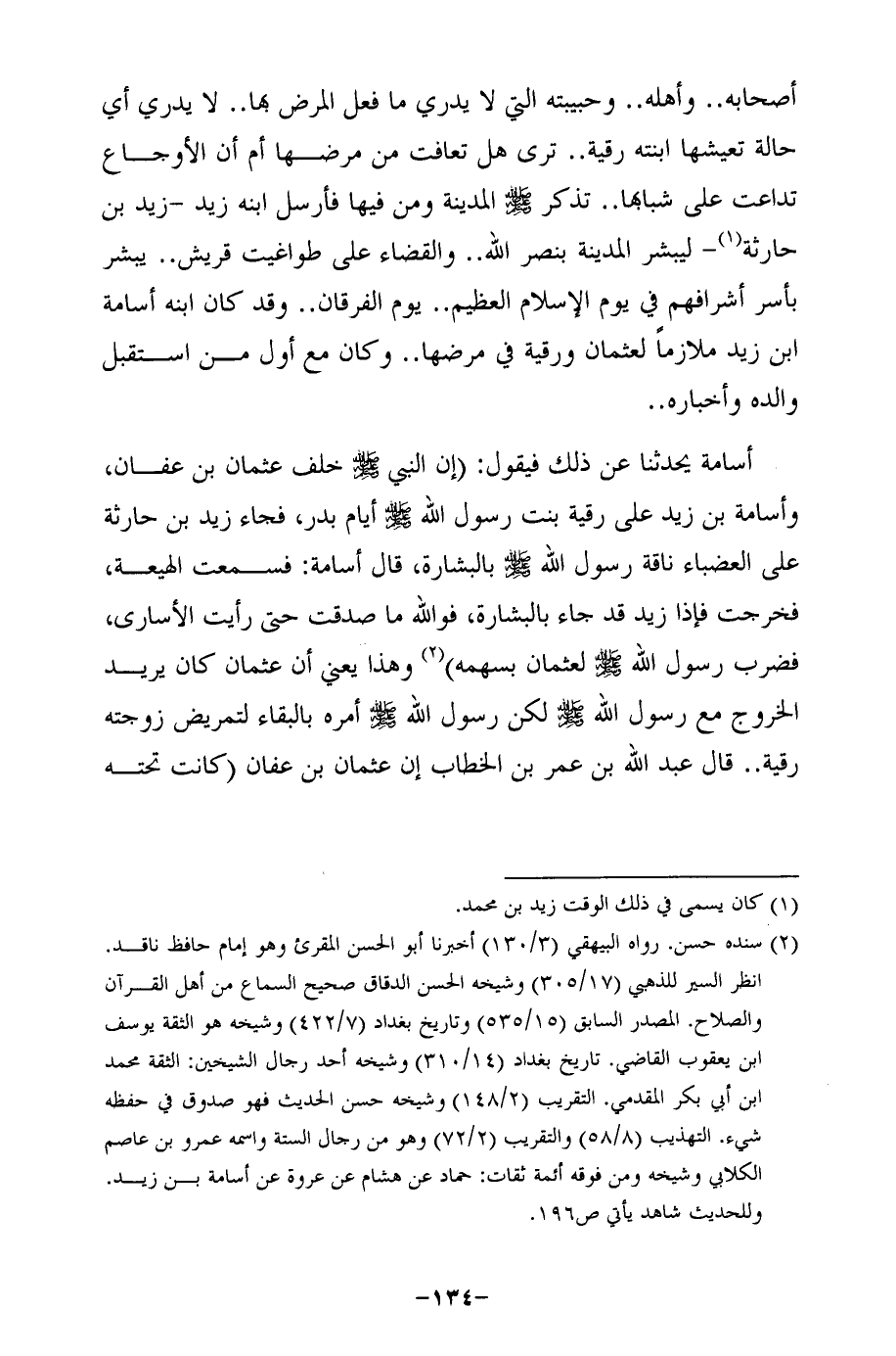 أصحابه .. وأهله .. وحبيبته التي لا يدري ما فعل المرض بها .. لا يدري أي حالة تعيشها ابنته رقية .. ترى هل تعافت من مرضها أم أن الأوجاع تداعت على شبابها .. تذكر - صلى الله عليه وسلم - المدينة ومن فيها فأرسل ابنه زيد -زيد بن حارثة (¬1) - ليبشر المدينة بنصر الله .. والقضاء على طواغيت قريش .. يبشر بأسر أشرافهم في يوم الإِسلام العظيم .. يوم الفرقان .. وقد كان ابنه أسامة ابن زيد ملازمًا لعثمان ورقية في مرضها .. وكان مع أول من استقبل والده وأخباره ..