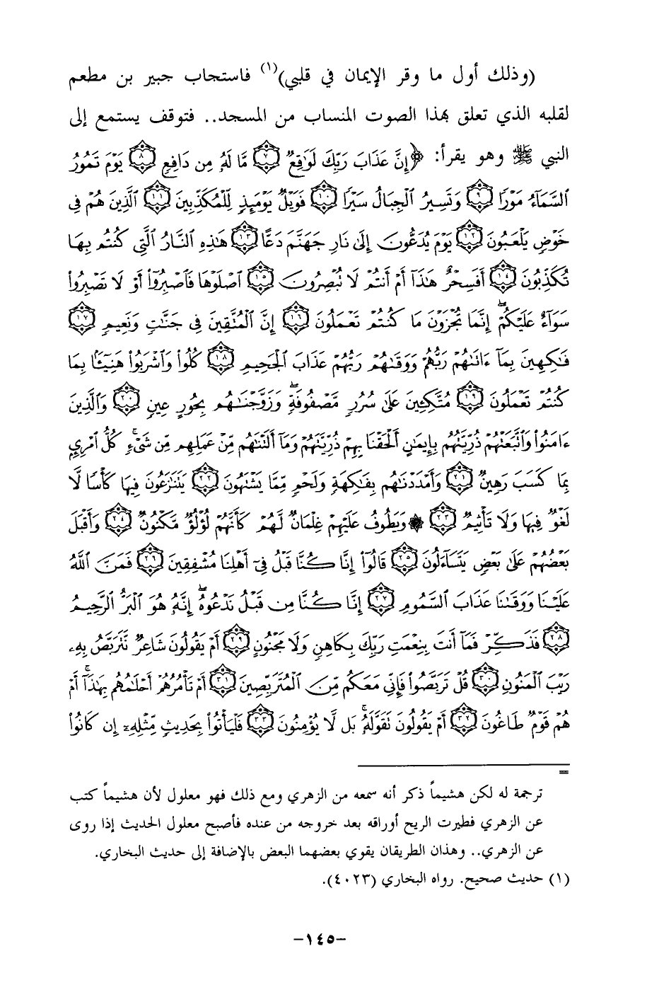 (وذلك أول ما وقر الإيمان في قلبي) (¬1) فاستجاب جبير بن مطعم لقلبه الذي تعلق هذا الصوت المنساب من المسجد .. فتوقف يستمع إلى النبي - صلى الله عليه وسلم - وهو يقرأ: {إِنَّ عَذَابَ رَبِّكَ لَوَاقِعٌ (7) مَا لَهُ مِنْ دَافِعٍ (8) يَوْمَ تَمُورُ السَّمَاءُ مَوْرًا (9) وَتَسِيرُ الْجِبَالُ سَيْرًا (10) فَوَيْلٌ يَوْمَئِذٍ لِلْمُكَذِّبِينَ (11) الَّذِينَ هُمْ فِي خَوْضٍ يَلْعَبُونَ (12) يَوْمَ يُدَعُّونَ إِلَى نَارِ جَهَنَّمَ دَعًّا (13) هَذِهِ النَّارُ الَّتِي كُنْتُمْ بِهَا تُكَذِّبُونَ (14) أَفَسِحْرٌ هَذَا أَمْ أَنْتُمْ لَا تُبْصِرُونَ (15) اصْلَوْهَا فَاصْبِرُوا أَوْ لَا تَصْبِرُوا سَوَاءٌ عَلَيْكُمْ إِنَّمَا تُجْزَوْنَ مَا كُنْتُمْ تَعْمَلُونَ (16) إِنَّ الْمُتَّقِينَ فِي جَنَّاتٍ وَنَعِيمٍ (17) فَاكِهِينَ بِمَا آتَاهُمْ رَبُّهُمْ وَوَقَاهُمْ رَبُّهُمْ عَذَابَ الْجَحِيمِ (18) كُلُوا وَاشْرَبُوا هَنِيئًا بِمَا كُنْتُمْ تَعْمَلُونَ (19) مُتَّكِئِينَ عَلَى سُرُرٍ مَصْفُوفَةٍ وَزَوَّجْنَاهُمْ بِحُورٍ عِينٍ (20) وَالَّذِينَ آمَنُوا وَاتَّبَعَتْهُمْ ذُرِّيَّتُهُمْ بِإِيمَانٍ أَلْحَقْنَا بِهِمْ ذُرِّيَّتَهُمْ وَمَا أَلَتْنَاهُمْ مِنْ عَمَلِهِمْ مِنْ شَيْءٍ كُلُّ امْرِئٍ بِمَا كَسَبَ رَهِينٌ (21) وَأَمْدَدْنَاهُمْ بِفَاكِهَةٍ وَلَحْمٍ مِمَّا يَشْتَهُونَ (22) يَتَنَازَعُونَ فِيهَا كَأْسًا لَا لَغْوٌ فِيهَا وَلَا تَأْثِيمٌ (23) وَيَطُوفُ عَلَيْهِمْ غِلْمَانٌ لَهُمْ كَأَنَّهُمْ لُؤْلُؤٌ مَكْنُونٌ (24) وَأَقْبَلَ بَعْضُهُمْ عَلَى بَعْضٍ يَتَسَاءَلُونَ (25) قَالُوا إِنَّا كُنَّا قَبْلُ فِي أَهْلِنَا مُشْفِقِينَ (26) فَمَنَّ اللَّهُ عَلَيْنَا وَوَقَانَا عَذَابَ السَّمُومِ (27) إِنَّا كُنَّا مِنْ قَبْلُ نَدْعُوهُ إِنَّهُ هُوَ الْبَرُّ الرَّحِيمُ (28) فَذَكِّرْ فَمَا أَنْتَ بِنِعْمَتِ رَبِّكَ بِكَاهِنٍ وَلَا مَجْنُونٍ (29) أَمْ يَقُولُونَ شَاعِرٌ نَتَرَبَّصُ بِهِ رَيْبَ الْمَنُونِ (30) قُلْ تَرَبَّصُوا فَإِنِّي مَعَكُمْ مِنَ الْمُتَرَبِّصِينَ (31) أَمْ تَأْمُرُهُمْ أَحْلَامُهُمْ بِهَذَا أَمْ هُمْ قَوْمٌ طَاغُونَ (32) أَمْ يَقُولُونَ تَقَوَّلَهُ بَلْ لَا يُؤْمِنُونَ (33) فَلْيَأْتُوا بِحَدِيثٍ مِثْلِهِ إِنْ كَانُوا
