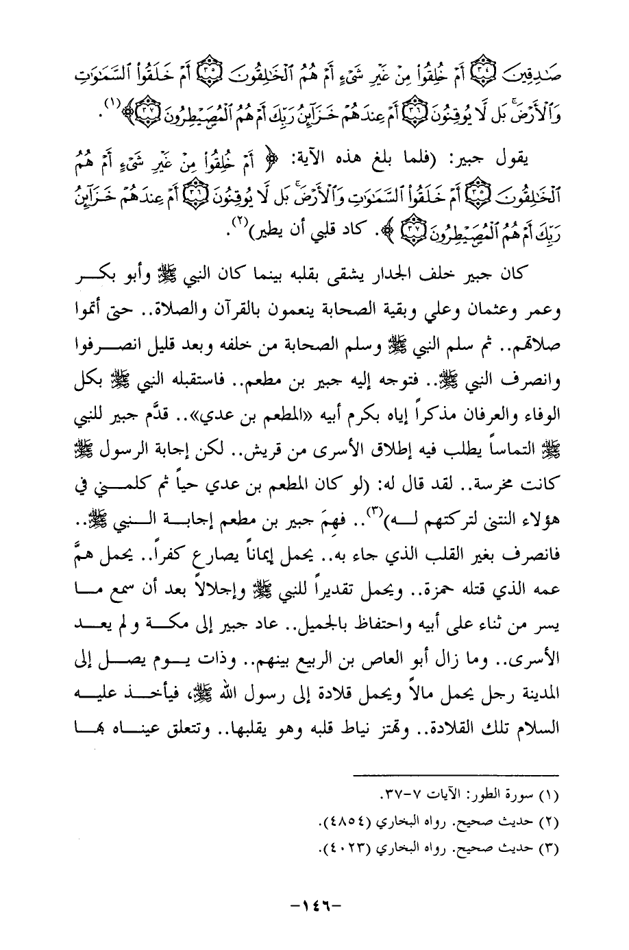 كان جبير خلف الجدار يشقى بقلبه بينما كان النبي - صلى الله عليه وسلم - وأبو بكر وعمر وعثمان وعلي وبقية الصحابة ينعمون بالقرآن والصلاة .. حتى أتموا صلاتهم .. ثم سلم النبي - صلى الله عليه وسلم - وسلم الصحابة من خلفه وبعد قليل انصرفوا وانصرف النبي - صلى الله عليه وسلم - .. فتوجه إليه جبير بن مطعم .. فاستقبله النبي - صلى الله عليه وسلم - بكل الوفاء والعرفان مذكرًا إياه بكرم أبيه "المطعم بن عدي" .. قدَّم جبير للنبي - صلى الله عليه وسلم - التماسًا يطلب فيه إطلاق الأسرى من قريش .. لكن إجابة الرسول - صلى الله عليه وسلم - كانت مخرسة .. لقد قال له: (لو كان المطعم بن عدي حيًا ثم كلمني في هؤلاء النتنى لتركتهم له) (¬3) .. فهِمَ جبير بن مطعم إجابة النبي - صلى الله عليه وسلم - .. فانصرف بغير القلب الذي جاء به .. يحمل إيمانًا يصارع كفرًا .. يحمل همَّ عمه الذي قتله حمزة .. ويحمل تقديرًا للنبي - صلى الله عليه وسلم - وإجلالًا بعد أن سمع ما يسر من ثناء على أبيه واحتفاظ بالجميل .. عاد جبير إلى مكة ولم يعد الأسرى .. وما زال أبو العاص بن الربيع بينهم .. وذات يوم يصل إلى المدينة رجل يحمل مالًا ويحمل قلادة إلى رسول الله - صلى الله عليه وسلم -، فيأخذ عليه السلام تلك القلادة .. وتهتز نياط قلبه وهو يقلبها .. وتتعلق عيناه بها