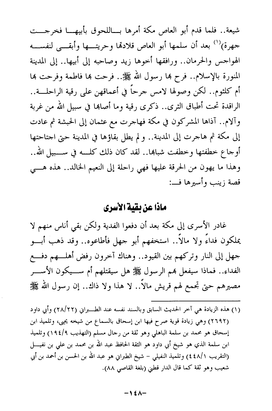 (¬1) هذه الزيادة هي آخر الحديث السابق وبالسند نفسه عند الطبراني (22/ 28) وأبي داود (2692) وهي زيادة قوية صرح فيها ابن إسحاق بالسماع من شيخه يحيى، وتلميذ ابن إسحاق هو محمَّد بن سلمة الباهلي وهو ثقة من رجال مسلم (التهذيب 9/ 194) وتلميذ ابن سلمة الذي هو شيخ أبي داود هو الثقة الحافظ عبد الله بن محمَّد بن علي بن نفيل (التقريب 1/ 448) وتلميذ النفيلي - شيخ الطبراني هو عبد الله بن الحسن بن أحمد بن أبي شعيب وهو ثقة كما قال الدارقطني (بلغة القاصي 88).