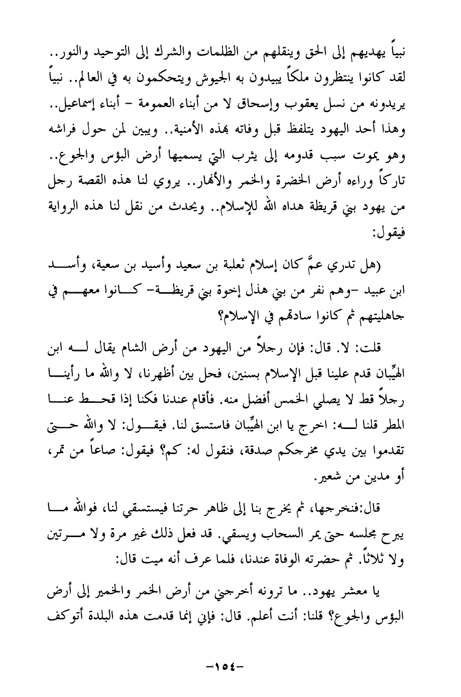 نبيًا يهديهم إلى الحق وينقلهم من الظلمات والشرك إلى التوحيد والنور .. لقد كانوا ينتظرون ملكًا يبيدون به الجيويش ويتحكمون به في العالم .. نبيًا يريدونه من نسل يعقوب وإسحاق لا من أبناء العمومة - أبناء إسماعيل .. وهذا أحد اليهود يتلفظ قبل وفاته بهذه الأمنية .. ويبين لمن حول فراشه وهو يموت سبب قدومه إلى يثرب التي يسميها أرض البؤس والجوع .. تاركًا وراءه أرض الخضرة والخمر والأنهار .. يروي لنا هذه القصة رجل من يهود بني قريظة هداه الله للإسلام .. ويحدث من نقل لنا هذه الرواية فيقول: