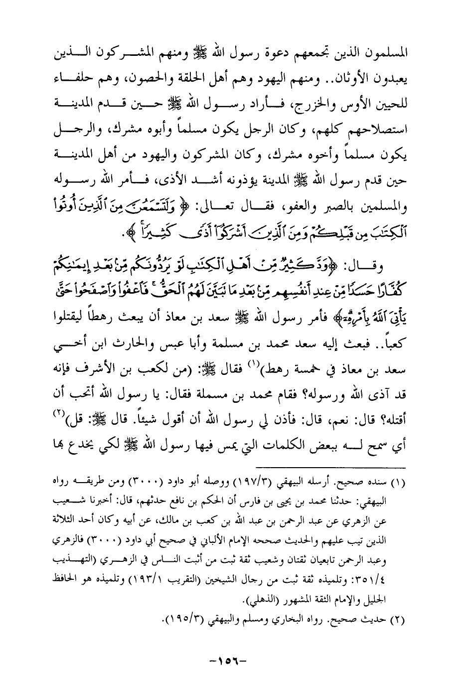 وقال: {وَدَّ كَثِيرٌ مِنْ أَهْلِ الْكِتَابِ لَوْ يَرُدُّونَكُمْ مِنْ بَعْدِ إِيمَانِكُمْ كُفَّارًا حَسَدًا مِنْ عِنْدِ أَنْفُسِهِمْ مِنْ بَعْدِ مَا تَبَيَّنَ لَهُمُ الْحَقُّ فَاعْفُوا وَاصْفَحُوا حَتَّى يَأْتِيَ اللَّهُ بِأَمْرِهِ} فأمر رسول الله - صلى الله عليه وسلم - سعد بن معاذ أن يبعث رهطًا ليقتلوا كعبًا .. فبعث إليه سعد محمَّد بن مسلمة وأبا عبس والحارث ابن أخي سعد بن معاذ في خمسة رهط) (¬1) فقال - صلى الله عليه وسلم -: (من لكعب بن الأشرف فإنه قد آذى الله ورسوله؟ فقام محمَّد بن مسملة فقال: يا رسول الله أتحب أن أقتله؟ قال: نعم، قال: فأذن لي رسول الله أن أقول شيئًا. قال - صلى الله عليه وسلم -: قل) (¬2) أي سمح له ببعض الكلمات التي يمس فيها رسول الله - صلى الله عليه وسلم - لكي يخدع بها