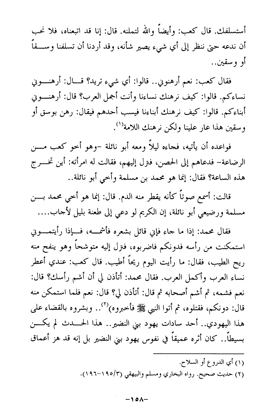 فقال محمَّد: إذا ما جاء فإني قائل بشعره فأشمه، فإذا رأيتموني استمكنت من رأسه فدونكم فاضربوه، فترل إليه متوشحًا وهو ينفح منه ريح الطيب، فقال: ما رأيت اليوم ريحًا أطيب. قال كعب: عندي أعطر نساء العرب وأكمل العرب. فقال محمَّد: أتأذن لي أن أشم رأسك؟ قال: نعم فشمه، ثم أشم أصحابه ثم قال: أتأذن لي؟ قال: نعم فلما استمكن منه قال: دونكم، فقتلوه، ثم أتوا النبي - صلى الله عليه وسلم - فأخبروه) (¬2) .. وبشروه بالقضاء على هذا اليهودي .. أحد سادات يهود بني النضير .. هذا الحدث لم يكن بسيطًا .. كان أثره عميقًا في نفوس يهود بن النضير بل إنه قد هز أعماق