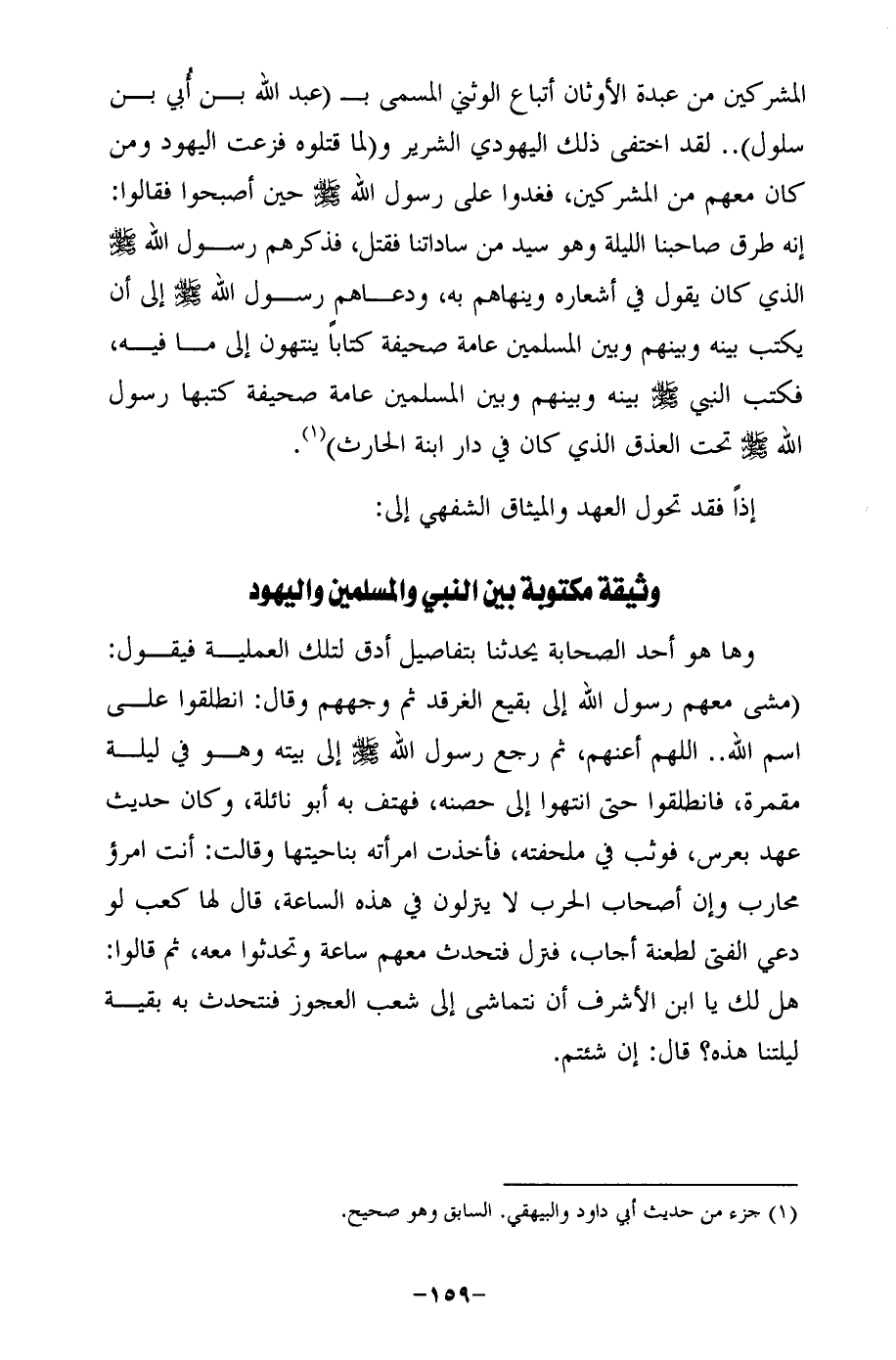 المشركين من عبدة الأوثان أتباع الوثني المسمى بـ (عبد الله بن أُبي بن سلول) .. لقد اختفى ذلك اليهودي الشرير و (لما قتلوه فزعت اليهود ومن كان معهم من المشركين، فغدوا على رسول الله - صلى الله عليه وسلم - حين أصبحوا فقالوا: إنه طرق صاحبنا الليلة وهو سيد من ساداتنا فقتل، فذكرهم رسول الله - صلى الله عليه وسلم - الذي كان يقول في أشعاره وينهاهم به، ودعاهم رسول الله - صلى الله عليه وسلم - إلى أن يكتب بينه وبينهم وبين المسلمين عامة صحيفة كتابًا ينتهون إلى ما فيه، فكتب النبي - صلى الله عليه وسلم - بينه وبينهم وبن المسلمين عامة صحيفة كتبها رسول الله - صلى الله عليه وسلم - تحت العذق الذي كان في دار ابنة الحارث) (¬1).
