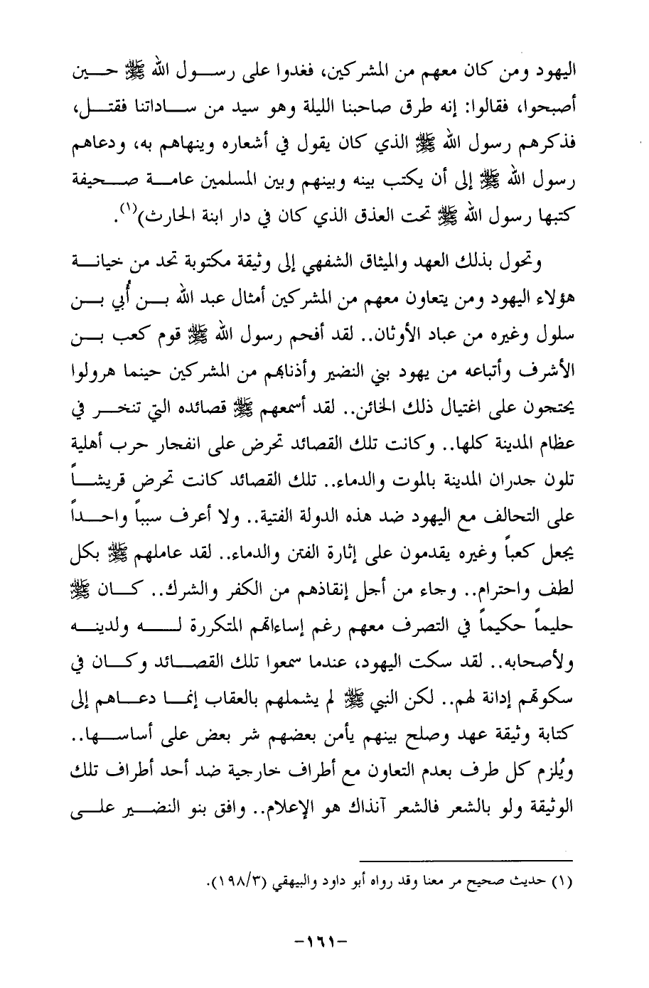 وتحول بذلك العهد والميثاق الشفهى إلى وثيقة مكتوبة تحد من خيانة هؤلاء اليهود ومن يتعاون معهم من المشركين أمثال عبد الله بن أُبي بن سلول وغيره من عباد الأوثان .. لقد أفحم رسول الله - صلى الله عليه وسلم - قوم كعب بن الأشرف وأتباعه من يهود بني النضير وأذنابهم من المشركين حينما هرولوا يحتجون على اغتيال ذلك الخائن .. لقد أسمعهم - صلى الله عليه وسلم - قصائده التي تنخر في عظام المدينة كلها .. وكانت تلك القصائد تحرض على انفجار حرب أهلية تلون جدران المدينة بالموت والدماء .. تلك القصائد كانت تحرض قريشًا على التحالف مع اليهود ضد هذه الدولة الفتية .. ولا أعرف سببًا واحدًا يجعل كعبًا وغيره يقدمون على إثارة الفتن والدماء .. لقد عاملهم - صلى الله عليه وسلم - بكل لطف واحترام .. وجاء من أجل إنقاذهم من الكفر والشرك .. كان - صلى الله عليه وسلم - حليمًا حكيمًا في التصرف معهم رغم إساءاتم المتكررة له ولدينه ولأصحابه .. لقد سكت اليهود، عندما سمعوا تلك القصائد وكان في سكوتهم إدانة لهم .. لكن النبي - صلى الله عليه وسلم - لم يشملهم بالعقاب إنما دعاهم إلى كتابة وثيقة عهد وصلح بينهم يأمن بعضهم شر بعض على أساسها .. ويُلزم كل طرف بعدم التعاون مع أطراف خارجية ضد أحد أطراف تلك الوثيقة ولو بالشعر فالشعر آنذاك هو الإعلام .. وافق بنو النضير على