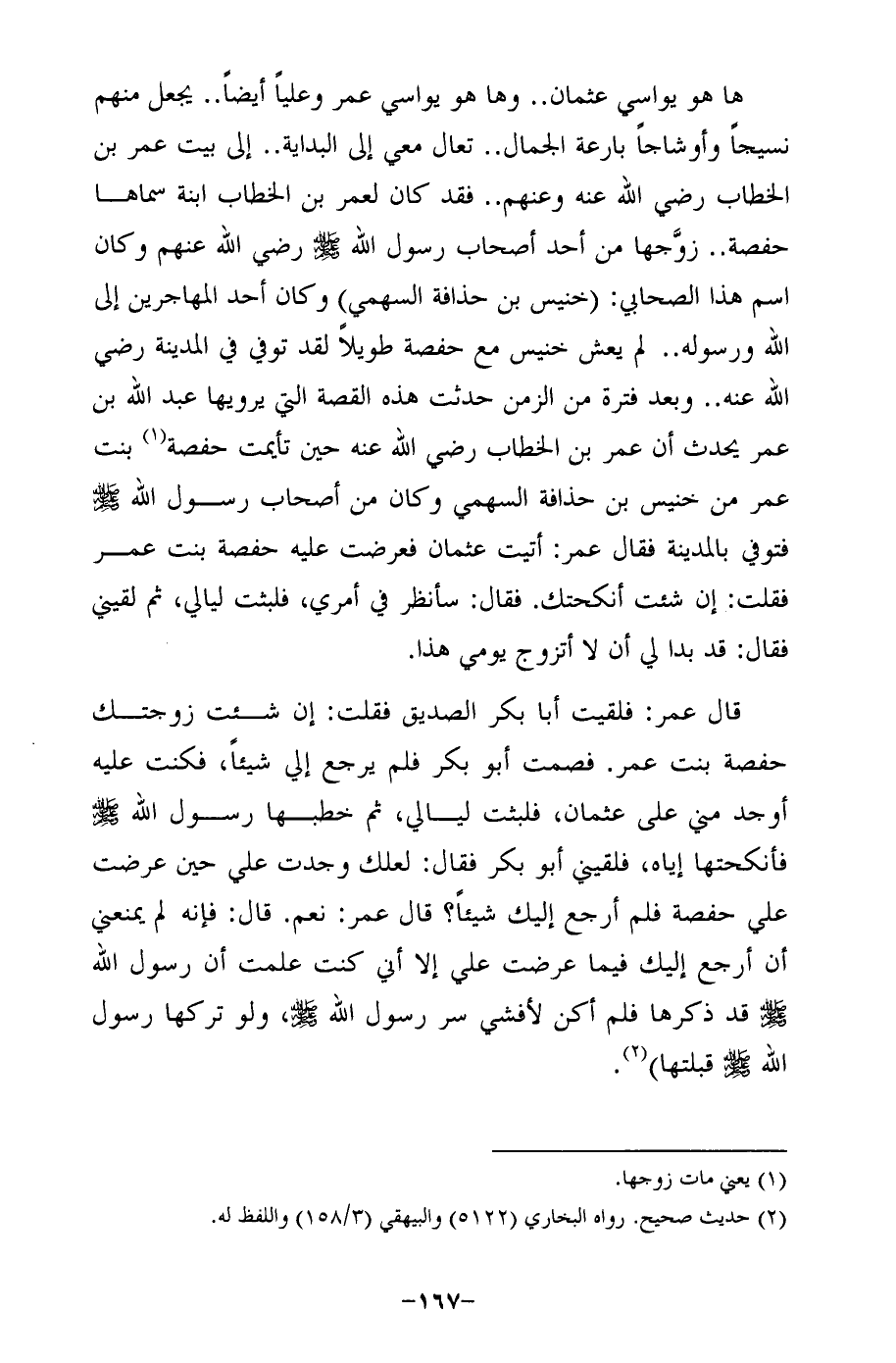 الله ورسوله .. لم يعش خنيس مع حفصة طويلًا لقد توفي في المدينة رضي الله عنه .. وبعد فترة من الزمن حدثت هذه القصة التي يرويها عبد الله بن عمر يحدث أن عمر بن الخطاب رضي الله عنه حين تأيمت حفصة (¬1) بنت عمر من خنيس بن حذافة السهمى وكان من أصحاب رسول الله - صلى الله عليه وسلم - فتوفي بالمدينة فقال عمر: أتيت عثمان فعرضت عليه حفصة بنت عمر فقلت: إن شئت أنكحتك. فقال: سأنظر في أمري، فلبثت ليالي، ثم لقيني فقال: قد بدا لي أن لا أتزوج يومي هذا.