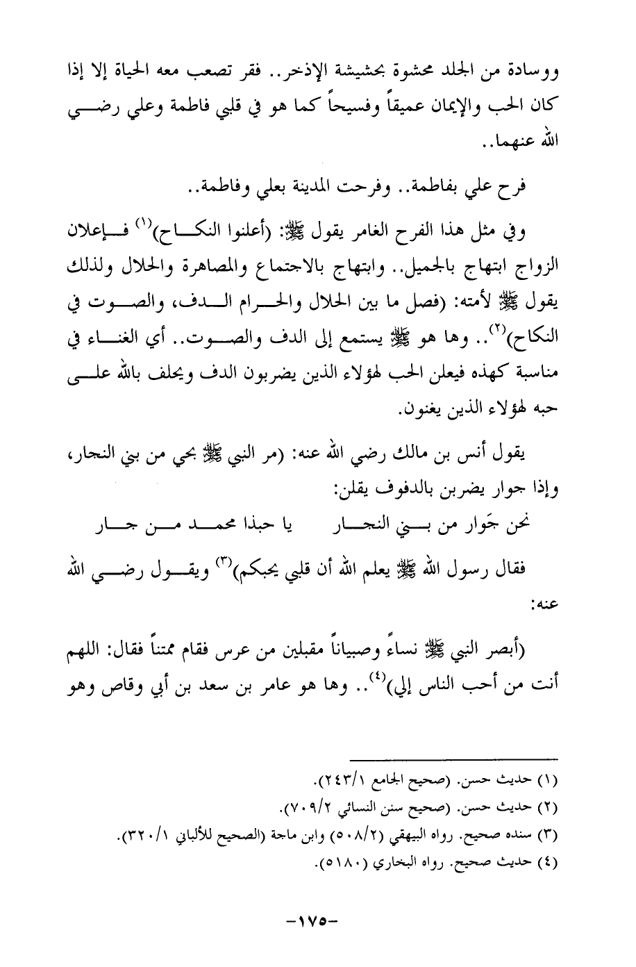 وفي مثل هذا الفرح الغامر يقول - صلى الله عليه وسلم -: (أعلنوا النكاح) (¬1) فإعلان الزواج ابتهاج بالجميل .. وابتهاج بالاجتماع والمصاهرة والحلال ولذلك يقول - صلى الله عليه وسلم - لأمته: (فصل ما بين الحلال والحرام الدف، والصوت في النكاح) (¬2) .. وها هو - صلى الله عليه وسلم - يستمع إلى الدف والصوت .. أي الغناء في مناسبة كهذه فيعلن الحب لهؤلاء الذين يضربون الدف ويحلف بالله على حبه لهؤلاء الذين يغنون.