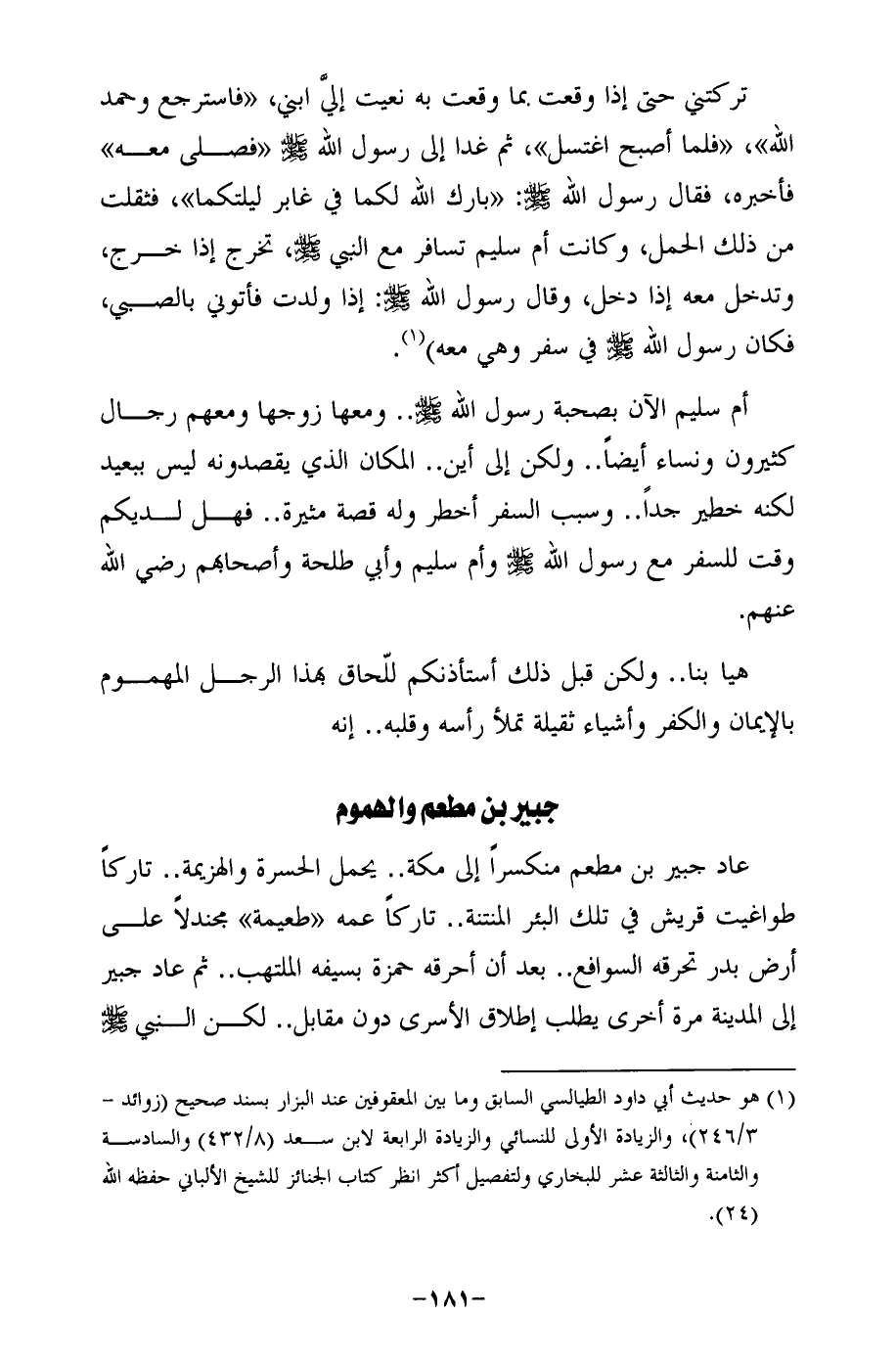 عاد جبير بن مطعم منكسرًا إلى مكة .. يحمل الحسرة والهزيمة .. تاركًا طواغيت قريش في تلك البئر المنتنة .. تاركًا عمه "طعيمة" مجندلًا على أرض بدر تحرقه السوافع .. بعد أن أحرقه حمزة بسيفه الملتهب .. ثم عاد جبير إلى المدينة مرة أخرى يطلب إطلاق الأسرى دون مقابل .. لكن النبي - صلى الله عليه وسلم -