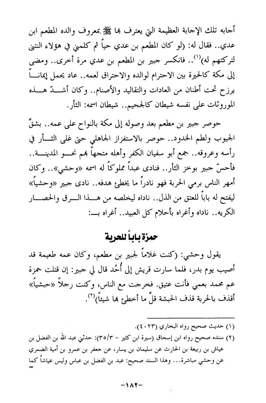 (¬2) سنده صحيح رواه ابن إسحاق (سيرة ابن كثير-3/ 35): حدثني عبد الله بن الفضل بن عياش بن ربيعة بن الحارث عن سليمان بن يسار, عن جعفر بن عمرو بن أمية الضمري عن وحشى مباشرة ... وهذا السند صحيح: عبد بن الفضل بن عباس وليس عياشًا كما =