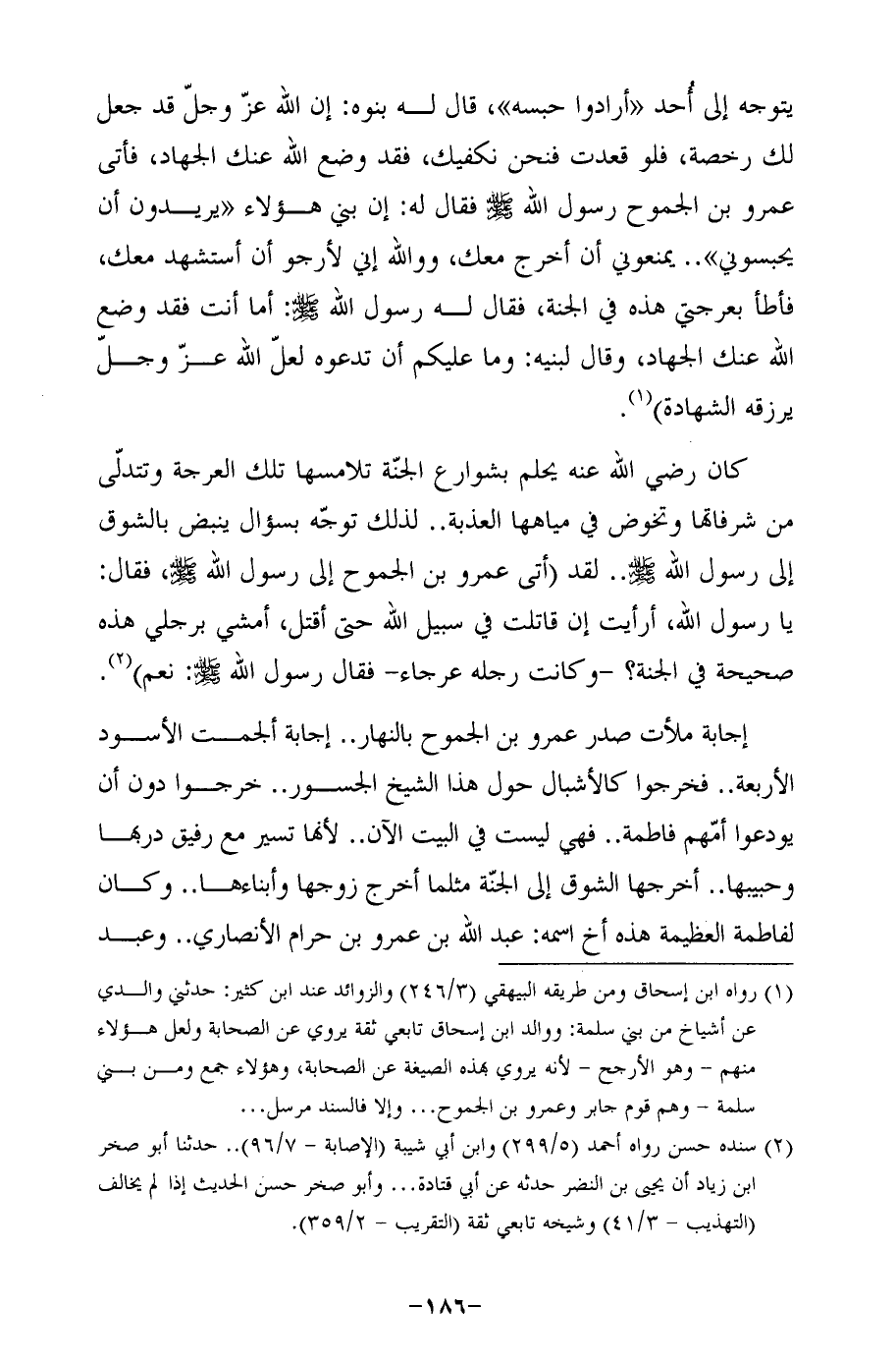 (¬1) رواه ابن إسحاق ومن طريقه البيهقي (3/ 246) والزوائد عند ابن كثير: حدثني والدي عن أشياخ من بني سلمة: ووالد ابن إسحاق تابعي ثقة يروي عن الصحابة ولعل هؤلاء منهم -وهو الأرجح- لأنه يروي هذه الصيغة عن الصحابة، وهؤلاء جمع ومن بني سلمة- وهم قوم جابر وعمرو بن الجموح ... وإلا فالسند مرسل ...
