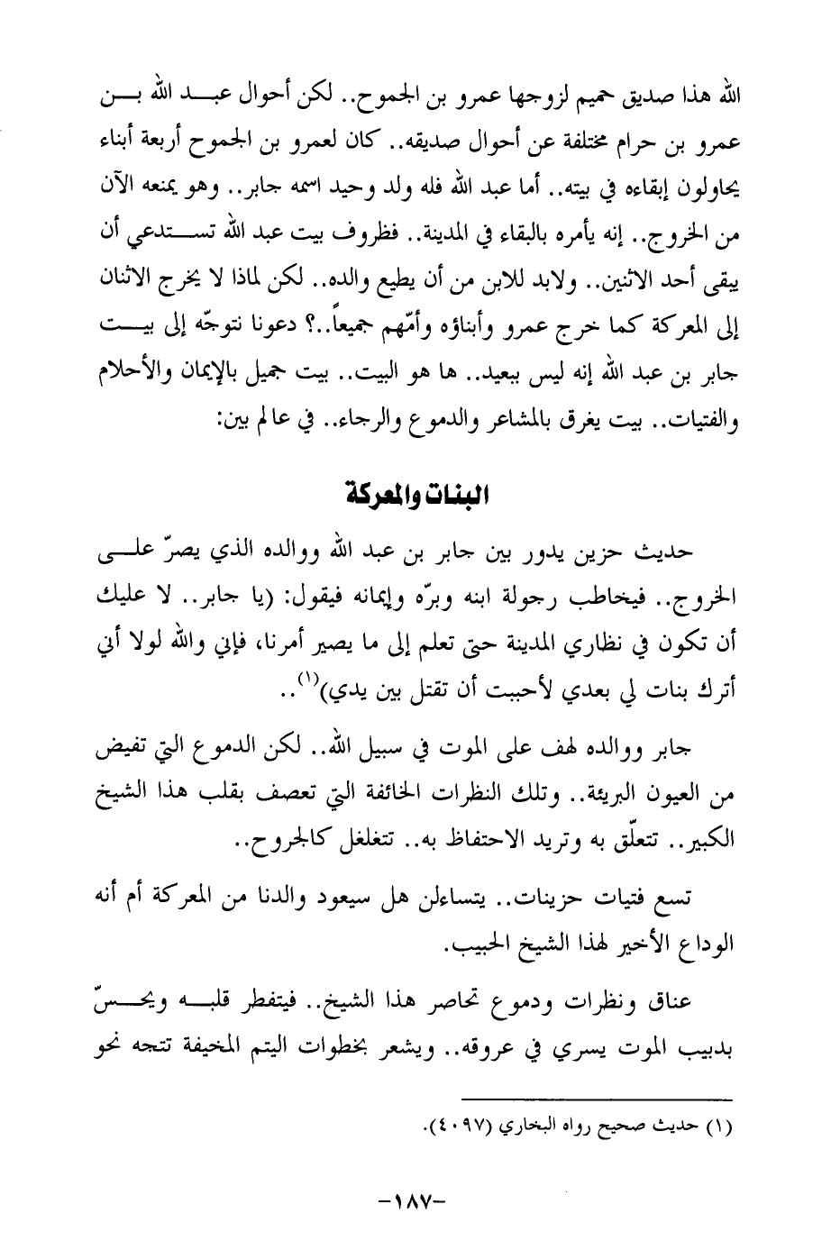 الله هذا صديق حميم لزوجها عمرو بن الجموح .. لكن أحوال عبد الله بن عمرو بن حرام مختلفة عن أحوال صديقه .. كان لعمرو بن الجموح أربعة أبناء يحاولون إبقاءه في بيته .. أما عبد الله فله ولد وحيد اسمه جابر .. وهو يمنعه الآن من الخروج .. إنه يأمره بالبقاء في المدينة .. فظروف بيت عبد الله تستدعي أن يبقى أحد الاثنين .. ولابد للابن من أن يطيع والده .. لكن لماذا لا يخرج الاثنان إلى المعركة كما خرج عمرو وأبناؤه وأمّهم جميعًا .. ؟ دعونا نتوجّه إلى بيت جابر بن عبد الله إنه ليس ببعيد .. ها هو البيت .. بيت جميل بالإيمان والأحلام والفتيات .. بيت يغرق بالمشاعر والدموع والرجال. في عالم بين: