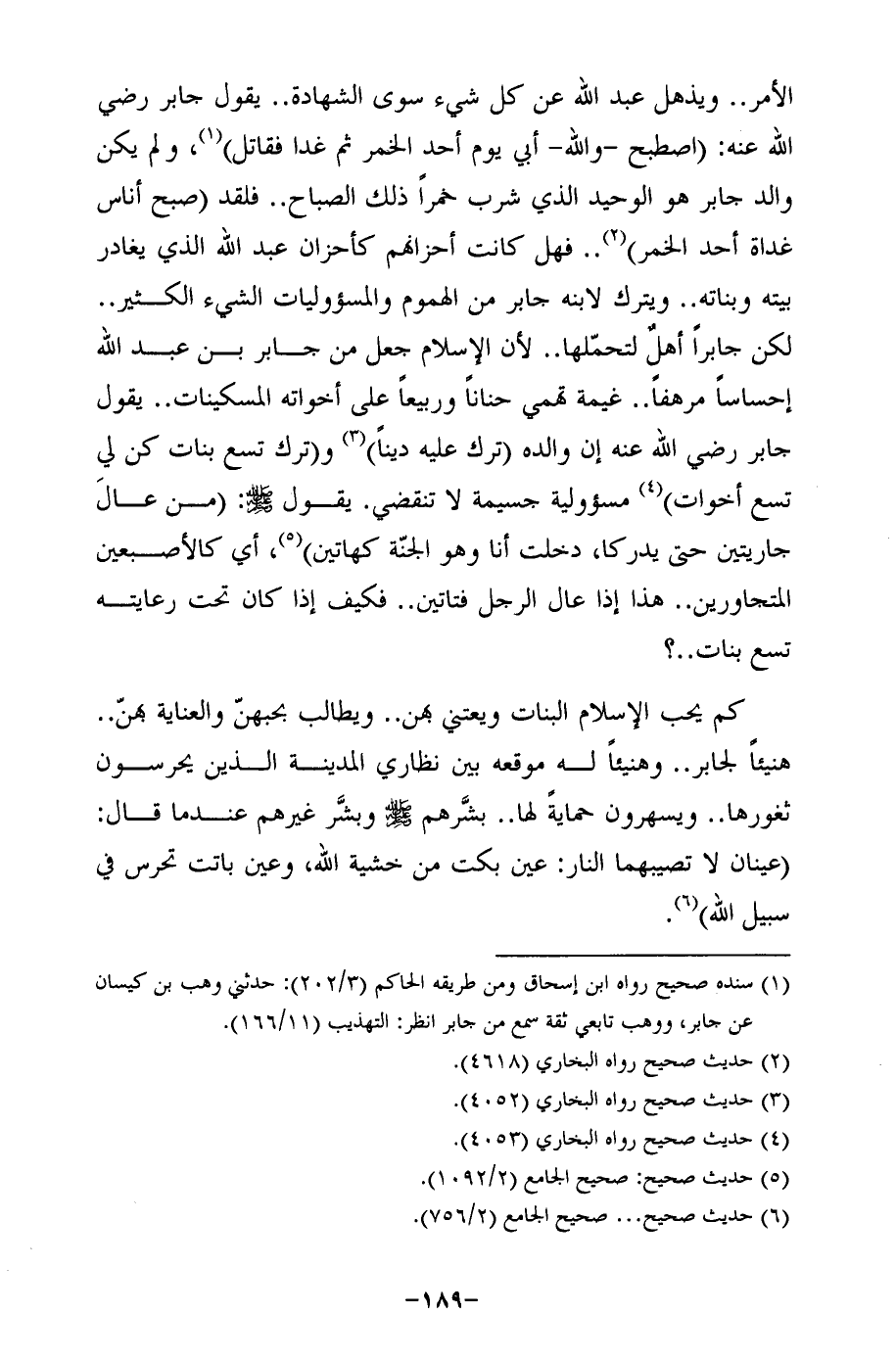 الأمر .. ويذهل عبد الله عن كل شيء سوى الشهادة .. يقول جابر رضي الله عنه: (اصطبح -والله - أبي يوم أحد الخمر ثم غدا فقاتل) (¬1)، ولم يكن والد جابر هو الوحيد الذي شرب خمرًا ذلك الصباح .. فلقد (صبح أناس غداة أحد الخمر) (¬2) .. فهل كانت أحزانهم كأحزان عبد الله الذي يغادر بيته وبناته .. ويترك لابنه جابر من الهموم والمسؤوليات الشيء الكثير .. لكن جابرًا أهلٌ لتحمّلها .. لأن الإِسلام جعل من جابر بن عبد الله إحساسًا مرهفًا .. غيمة تهمي حنانًا وربيعًا على أخواته المسكينات .. يقول جابر رضي الله عنه إن والده (ترك عليه دينًا) (¬3) و (ترك تسع بنات كن لي تسع أخوات) (¬4) مسؤولية جسيمة لا تنقضي. يقول - صلى الله عليه وسلم -: (من عالَ جاريتين حتى يدركا، دخلت أنا وهو الجنّة كهاتين) (¬5)، أي كالأصبعين المتجاورين .. هذا إذا عال الرجل فتاتين .. فكيف إذا كان تحت رعايته تسع بنات .. ؟
