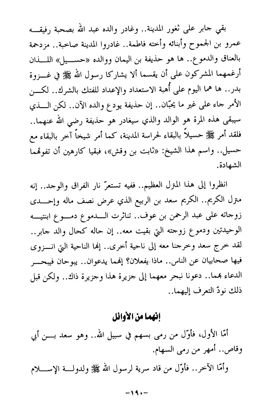 انظروا إلى هذا المنزل العظيم .. ففيه تستعرّ نار الفراق والوجد .. إنه منزل الكريم .. الكريم سعد بن الربيع الذي عرض نصف ماله وإحدى زوجاته على عبد الرحمن بن عوف .. تناثرت الدموع دموع ابنتيه الوحيدتن ودموع زوجته التي بقيت معه .. إن حاله كحال والد جابر .. لقد خرج سعد وخرجنا معه إلى ناحية أخرى .. إنها الناحية التي انزوى فيها صحابيان عن الناس .. ماذا يفعلان؟ إنهما يدعوان .. يبوحان فيبحر الدعاء بهما .. دعونا نبحر معهما إلى جزيرة هذا وجزيرة ذاك .. ولكن قبل ذلك نودّ التعرف إليهما ..